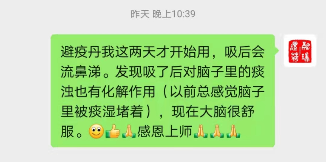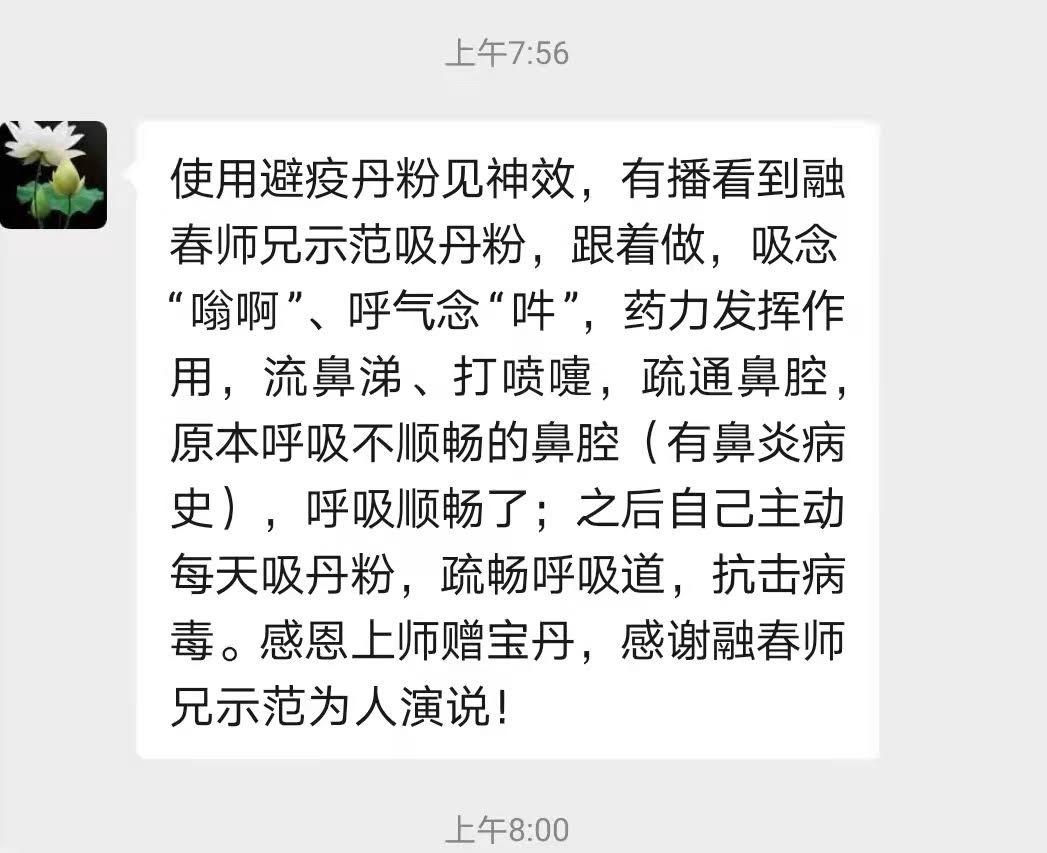 我再来说一下我们的避疫丹。大家手里可能都已经拿到避疫丹了,在拿到时或许还不清楚这药的神奇到底在哪里?不能吃不能喝,又不能注射。它的使用方法,是将少许药粉吸入鼻孔,从人体的上呼吸道进入,这个疗法太好了。当初还没人知道,现在全国各地来请我的避疫丹,在这个过程中也了解到现在至少有几家在研发类似方法。