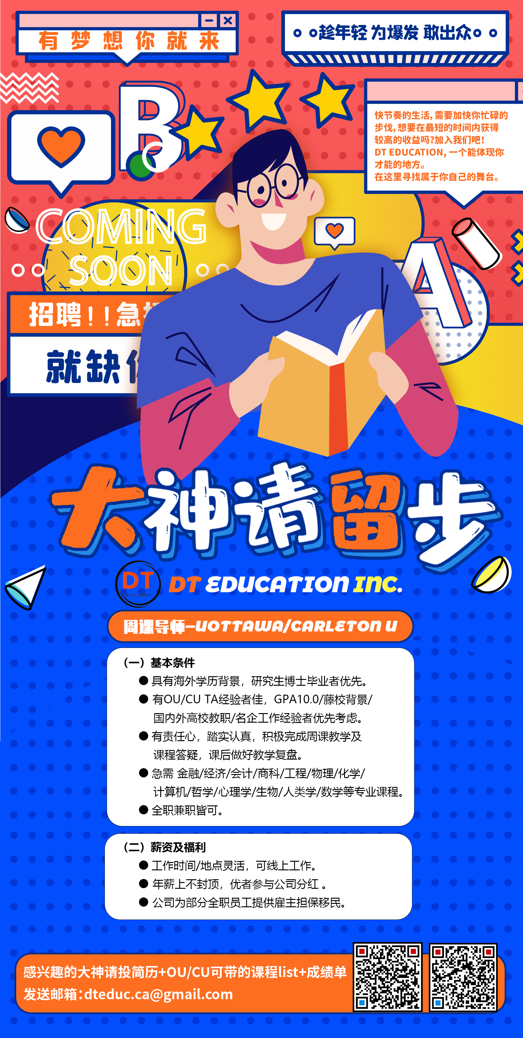 1. 急招全职/兼职本科经济/金融/会计等老师,全职老师可提供CPP/EI,帮助移民,工资待遇佳 2. 工作时间及上班地点灵活,网课为主,接受在家上班。 3. 本科毕业以上学历,有工作经验者优先。在校期间成绩优异,当过助教及gpa高者优先考虑。 4. 学习功底扎实,做事认真踏实。 5. 具体信息可加客服微信及发公司邮件联系。