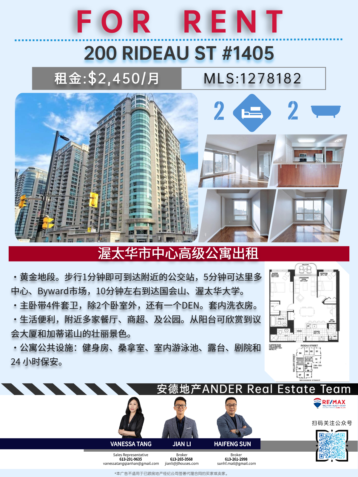 【安德地产】渥太华市中心黄金地段、2卧2卫高级公寓出租!