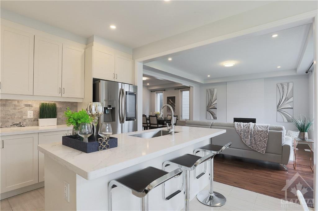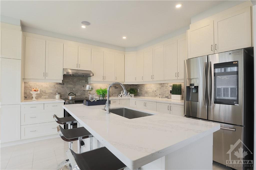 开放式厨房,配有高端智能化家电。全新加厚的石英台面和加宽岛台,