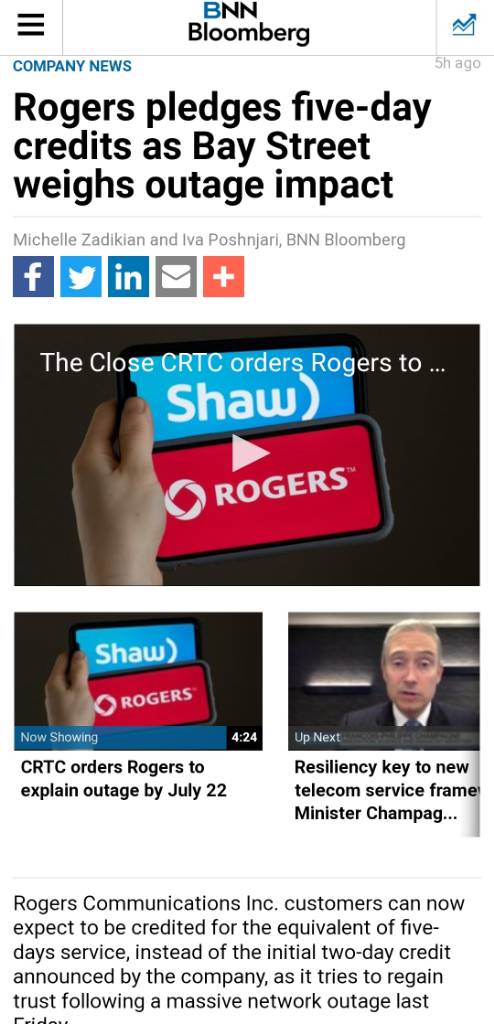 CBC News: Rogers to credit customers 5 days of service for outage.
