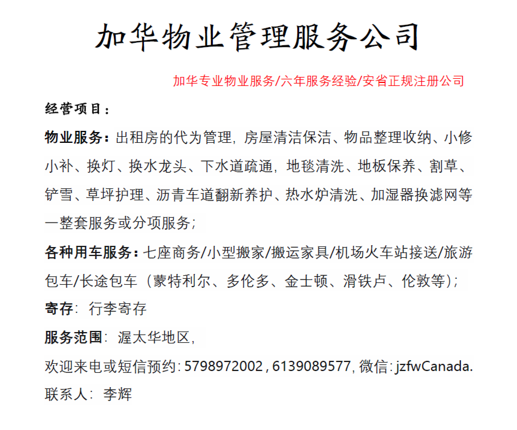 加华专业物业服务/七年服务经验/安省正规注册公司,可开正规发票: