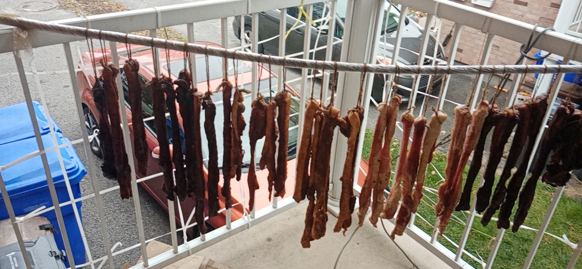 我发现食物放在门外,哪怕是二楼,也挡不住松鼠Cosco 的大块五花腩上星期一块减15,前天开始减20元,都是挑价格最小的买,减得越多。但不知现在还有没有。先后买了两大块,一块四十多元减15.一五十多元减20.都学整成腊肉。中间的是咸肉,没下生抽老抽。就打算这样挂在外面过冬。