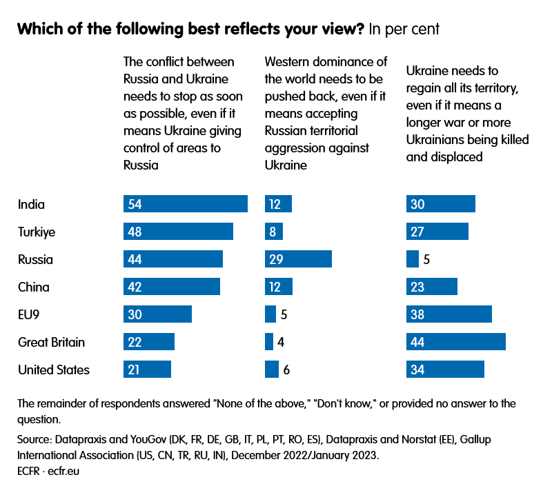 billwanhua 说: United West, divided from the rest: Global public opinion one year into Russia’s war on Ukraine New polling for ECFR reveals the West is consolidating – while facing an increasingly post-Western world, in which powers such as India and Turkiye are readier than ever to act independently. ecfr.eu 英文原版来了。 浏览附件1083491 点击展开... 还好, 多数人, 总算要求和平, 不是CFC个别人的追求. 有点欣慰.