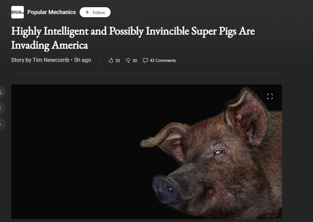 Originally crossbred to help farmed pigs grow larger and tolerate the cold temperatures of Canada, a drop in the market about two decades ago led some farmers to let their hybrid pigs run free. Now they’re running very free, according to Field and Stream. The super pigs are coming south, likely heading to Montana, North Dakota, Minnesota, and Michigan.