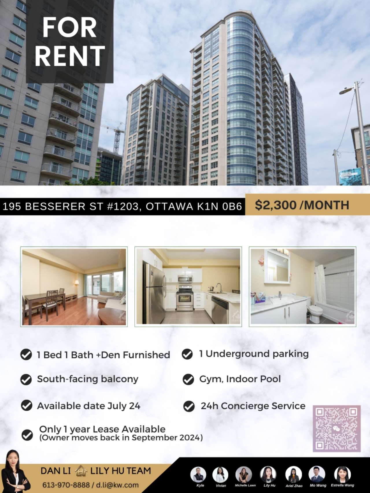 7月底最晚8月10号起租,租期一年,一年后房东需搬回自住。租金$2250,阳台朝南,13楼视野好,带家具拎包入住。一室一厅带DEN,一个卫生间,有洗衣机烘干机,电器齐全,有健身房游泳池,24小时保安。