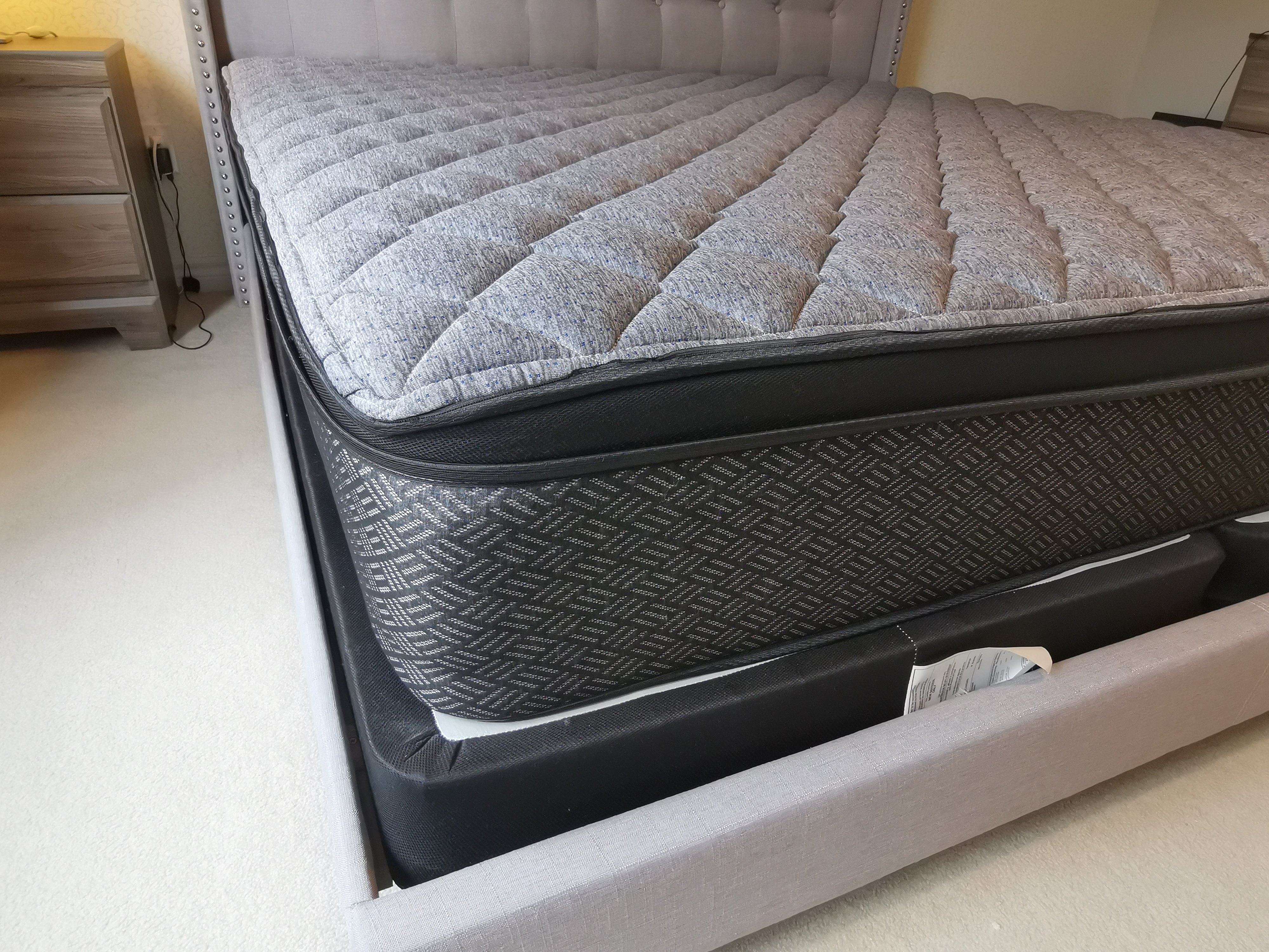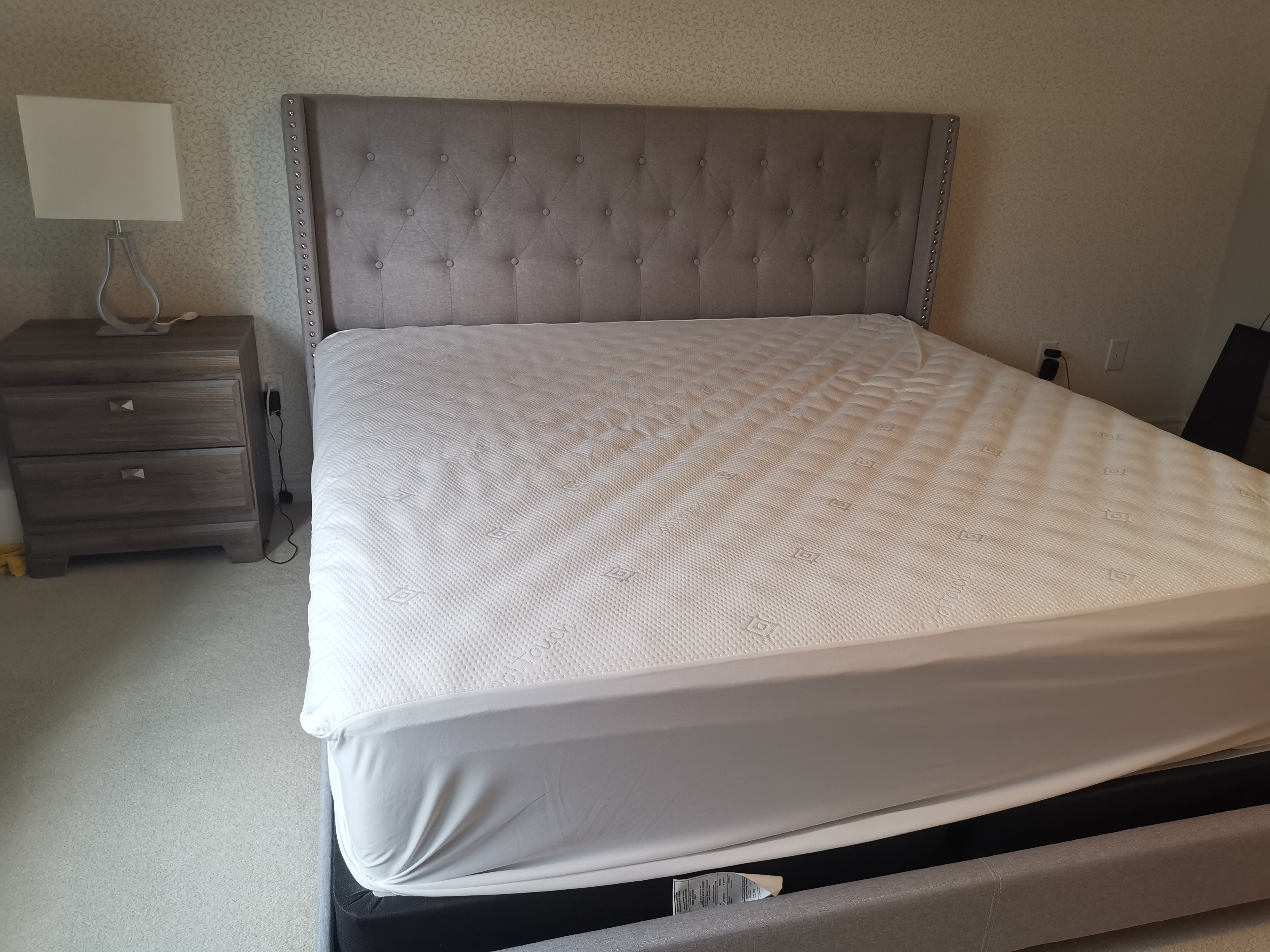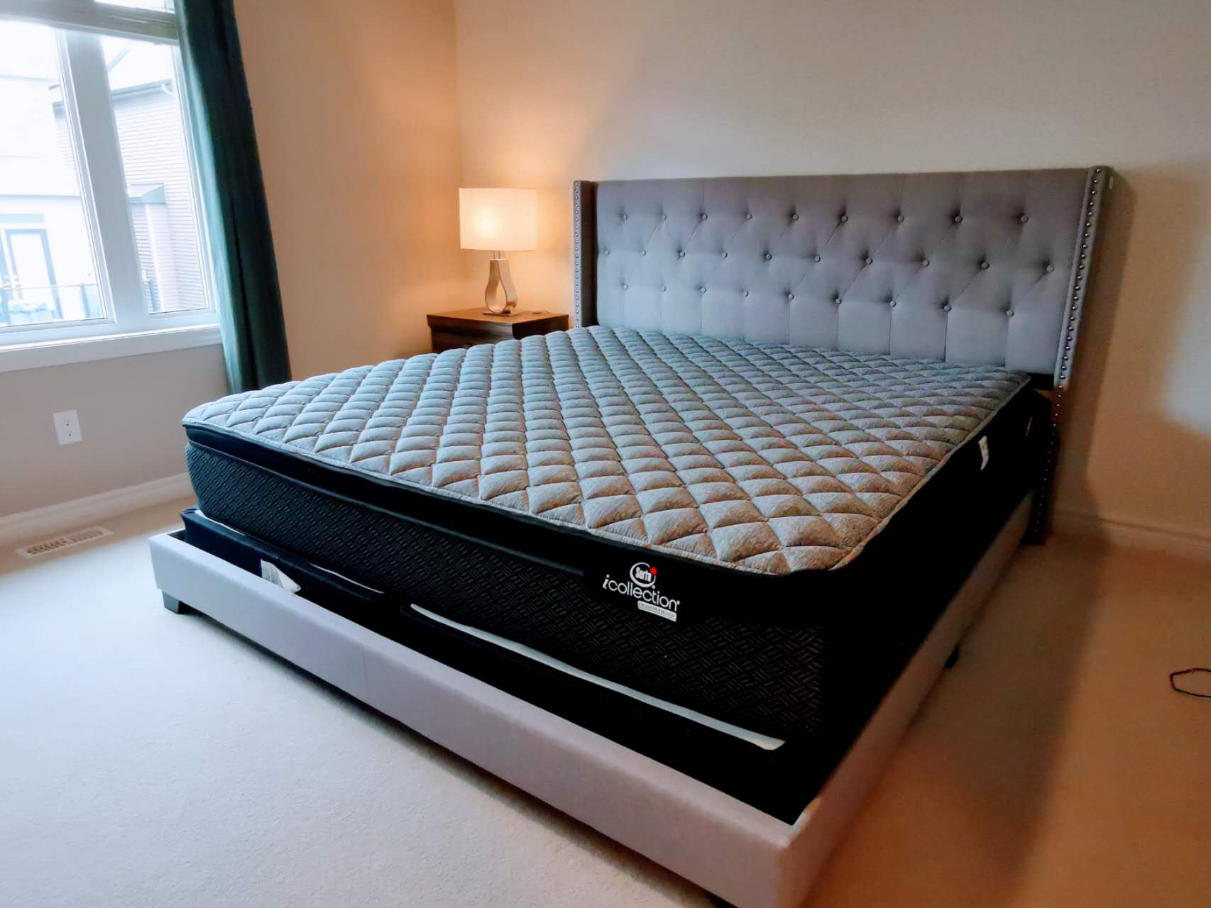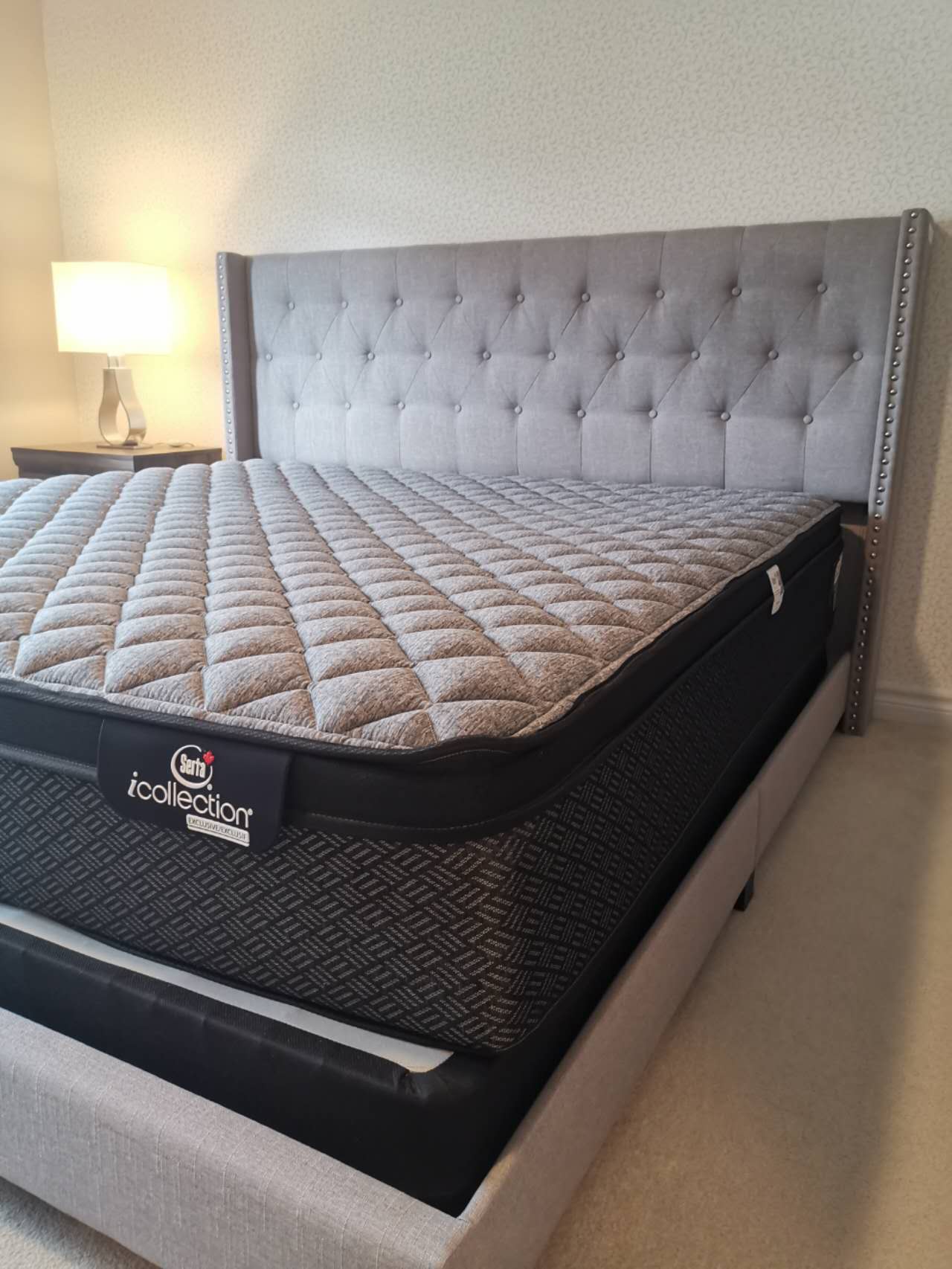 King size 的床架+床垫+ 垫盒 出让,Kanata 区可送货上门。 从 The Brick 买的。 床垫是品质高的 Serta 牌子 ( iCollection, Firm&Firm) , 特别的舒服。 只要价$850. 有意请联系 Stella 613-621-2015