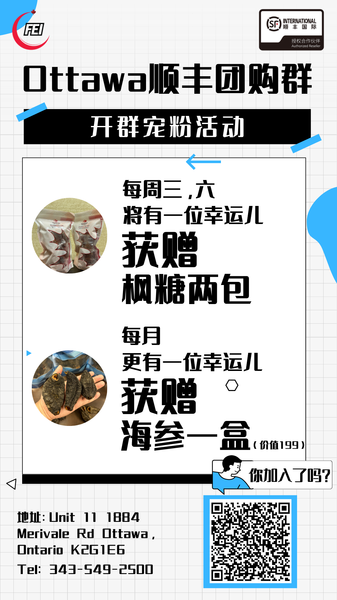 在这个充满欢乐的团购群里,我们为您准备了一系列精彩活动,让您尽情享受购物的乐趣!每周三和周六,将会有一位幸运儿获赠美味的枫糖两包,让您尝到加拿大的甜蜜滋味!而每个月,更有一位幸运儿将获赠珍贵的海参一盒,为您带来健康和美味。 无论您是顺丰的老朋友还是新加入的成员,都有机会参与我们的开群宠粉活动!我们热切期待您的加入,一同分享购物的快乐,共同赢取美味的好礼!快来加入Ottawa顺丰团购群,让幸运之星照耀您!