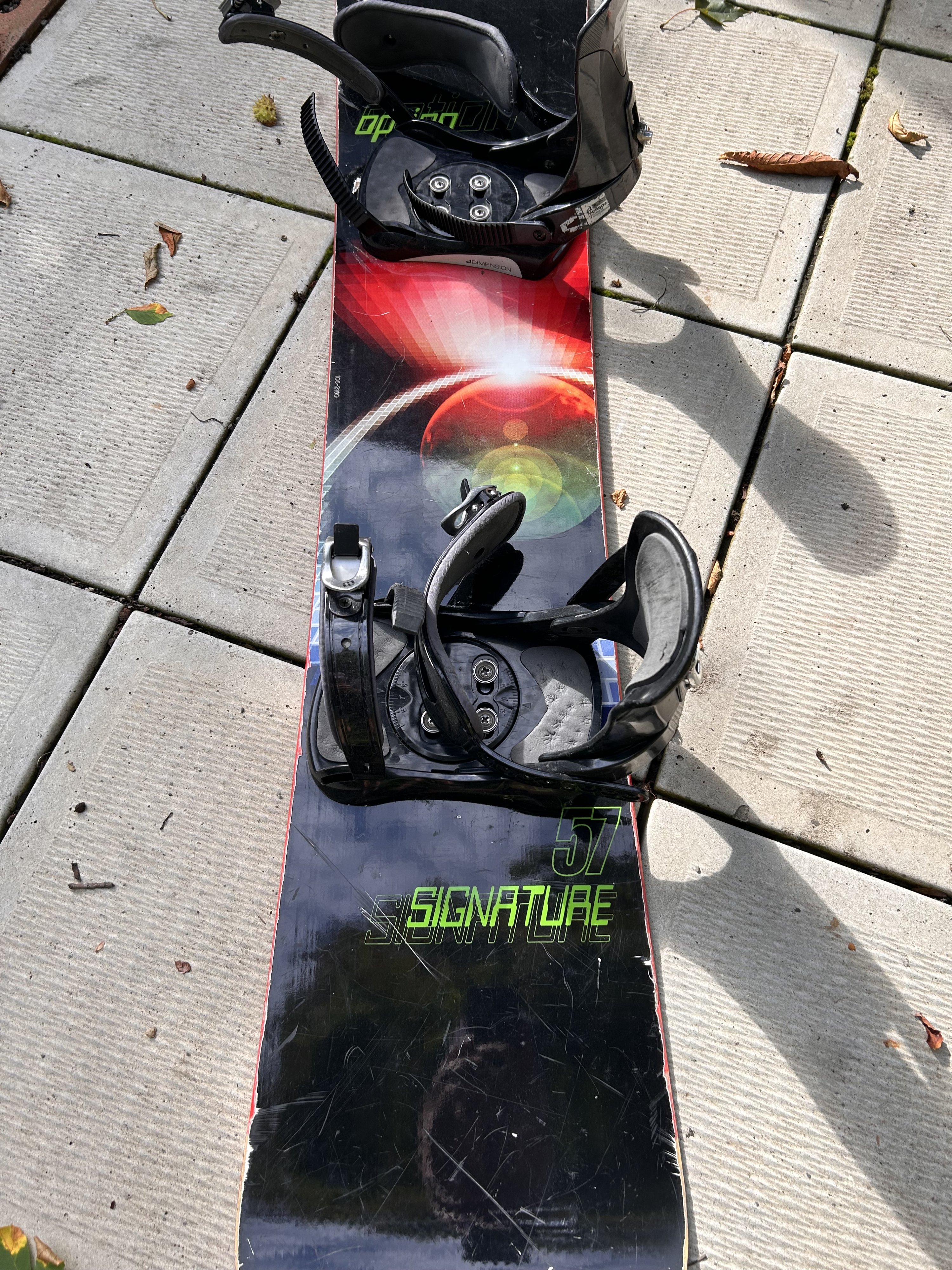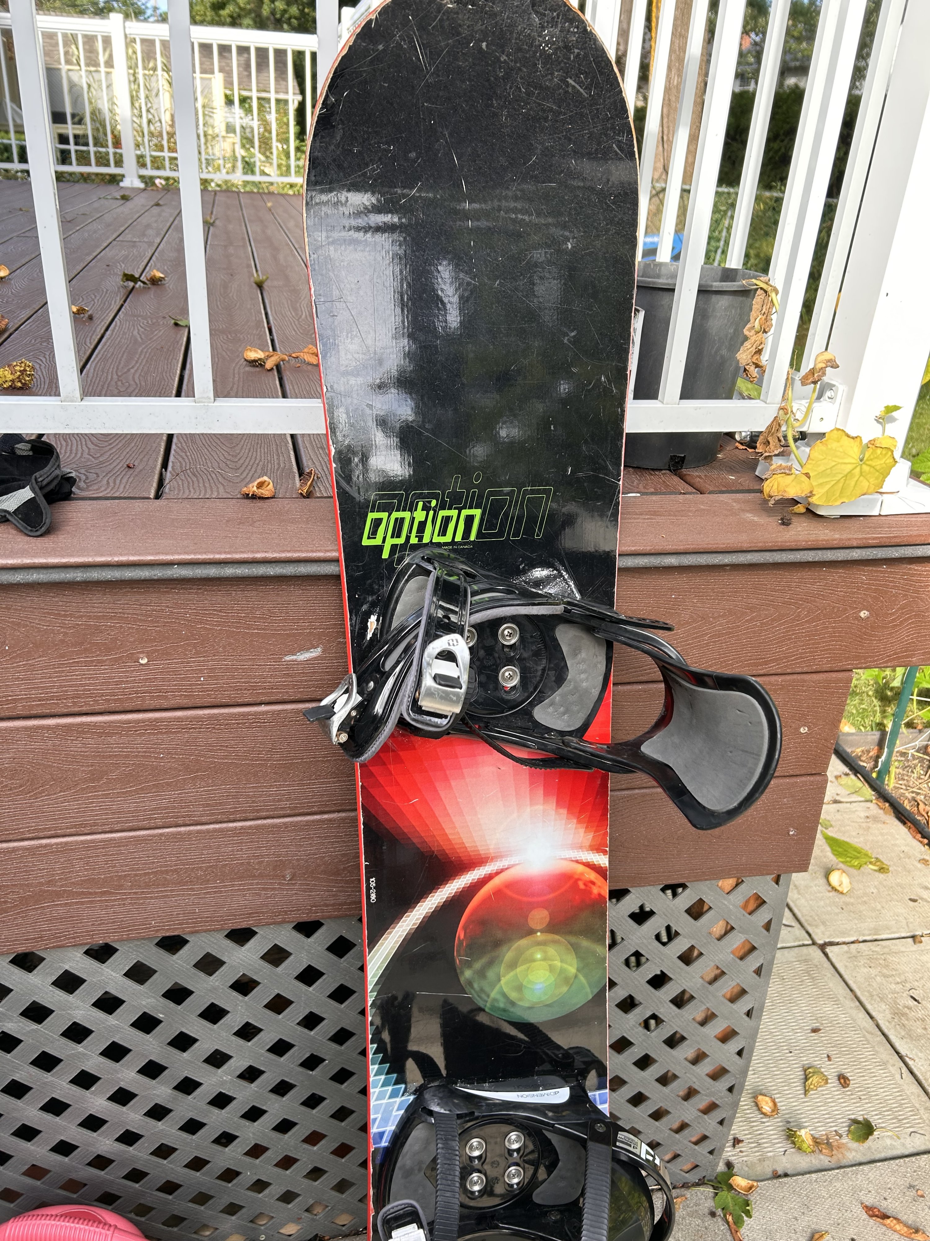 Snowboard option signature 57 with binding. Boots are Tyrant, 9.5 men size. All in working condition. Good set to learn snowboarding.