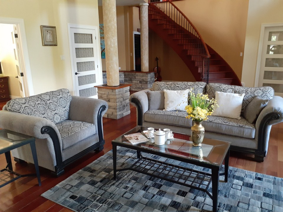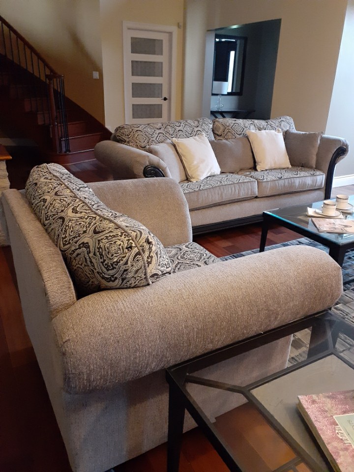 $1300 - Sofa set in like new conditions, 2 light color cushions excluded. Coffee table L48" x W24" x H19.5". Side table L24" x W24" x H24".