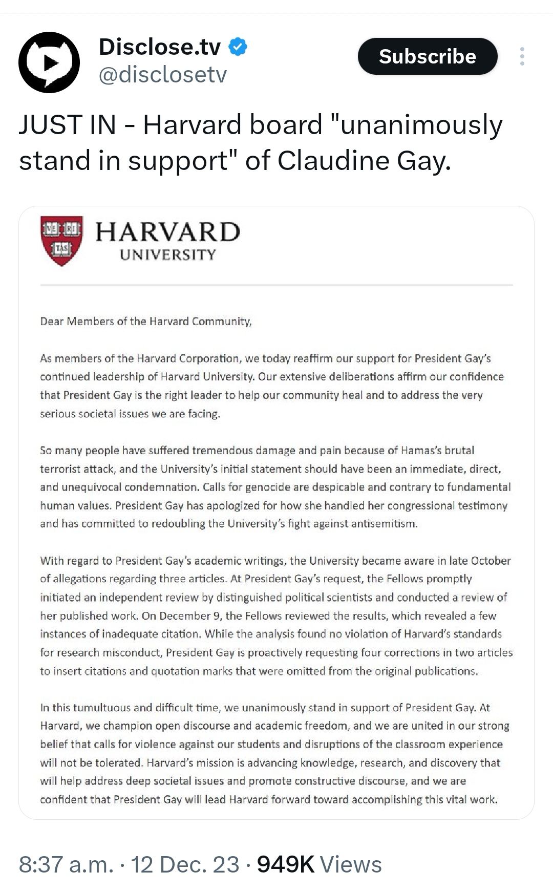 "Our extensive deliberations affirm our confidence that President Gay is the right leader to help our community heal and to address the very serious societal issues we are facing," the board, known as the Harvard Corporation, said on Tuesday.