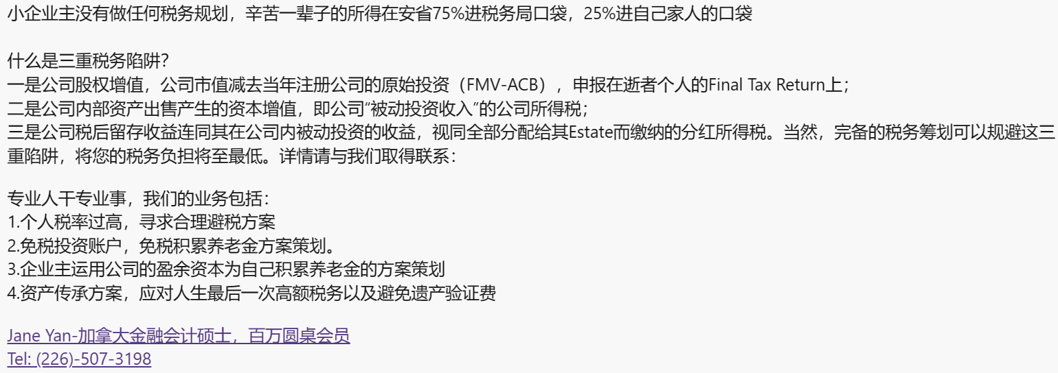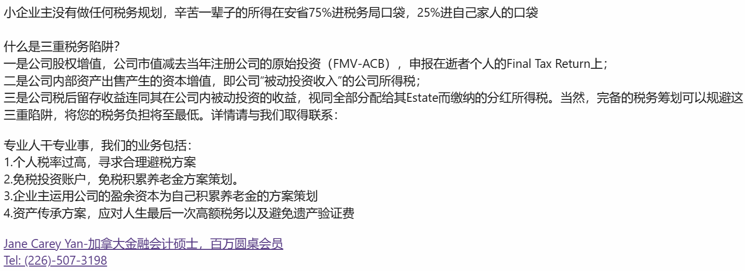 加国小枫叶 初级会员 注册 2021-04-10 消息 7,585 荣誉分数 32 声望点数 58 2024-01-10 #1 Jane Yan:613-416-3686 / 416-731-8765 金融硕士,持牌理财顾问 业务范围:免税投资,注册账户,家庭风险管控,企业避税方案! 附件 1704901608535.png 168.4 KB · 查看: 87 1704901822514.png 169 KB · 查看: 118 最后编辑: 2024-02-13
