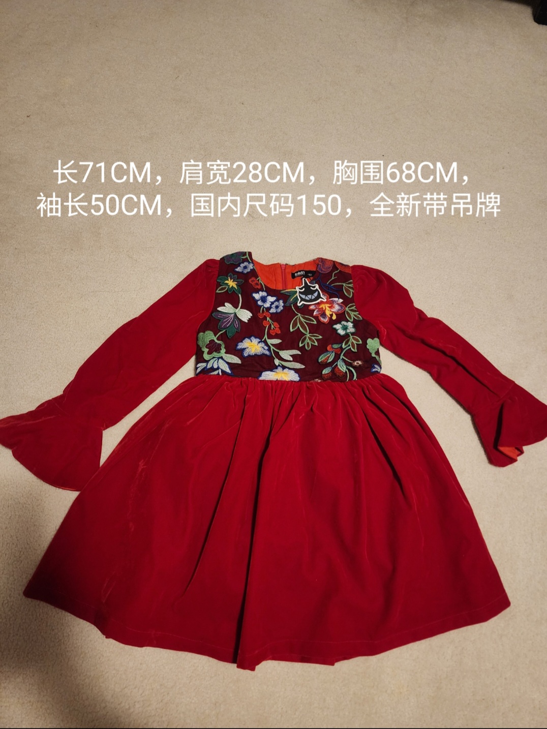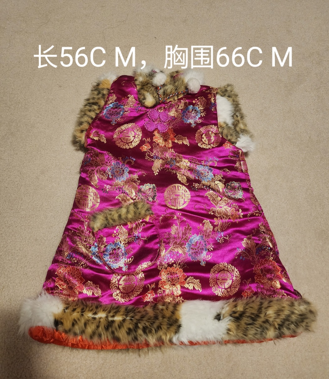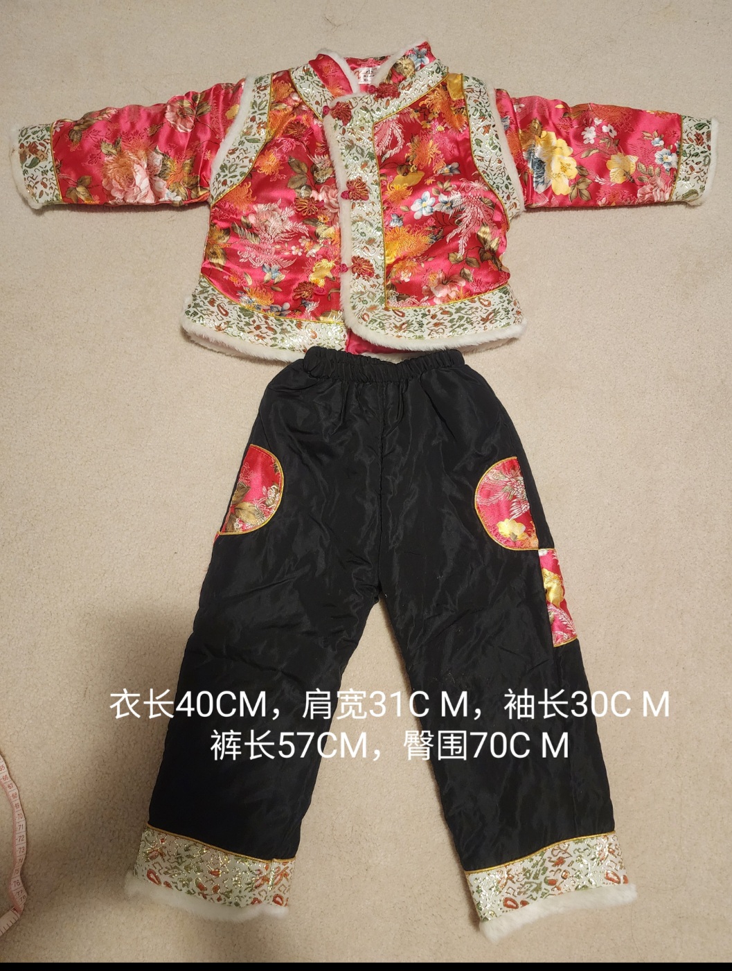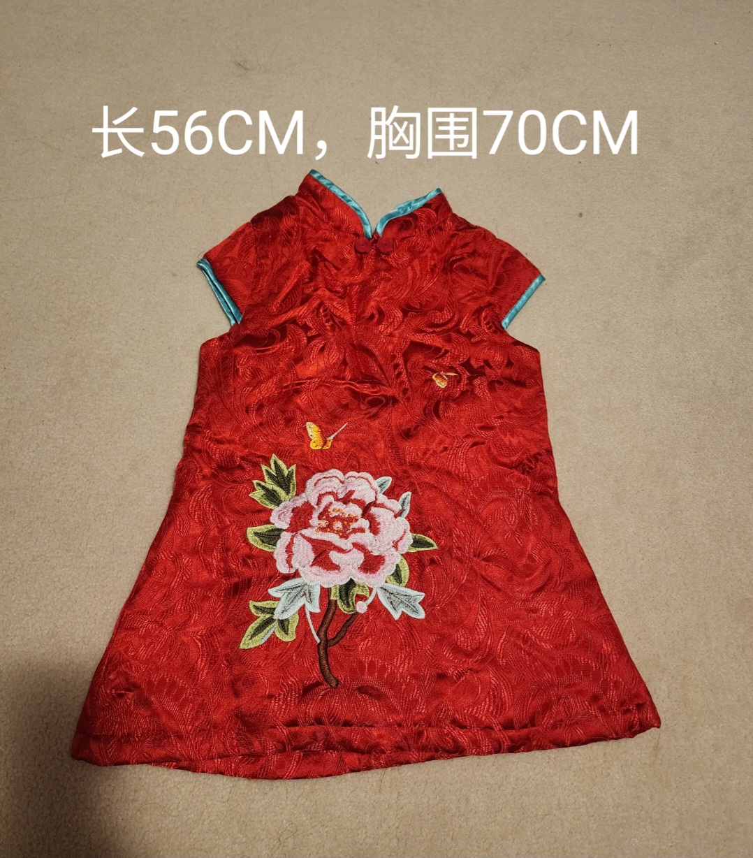 只穿过一两次,还一件全新,中国年必备。不太记得是几岁穿的了,有尺寸自己看吧。