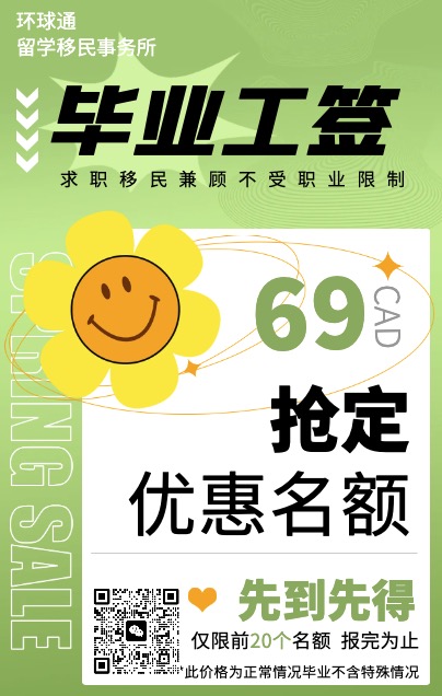 每年4~5月是加拿大留学生毕业旺季,环球通签证留学移民事务所为广大留学生准备了超低优惠办理毕业工签(Post Graduation Work Permit),仅需69加币(正常情况毕业),名额有限,如有需要的朋友们,欢迎咨询,祝各位小伙伴毕业考试顺利通过!!