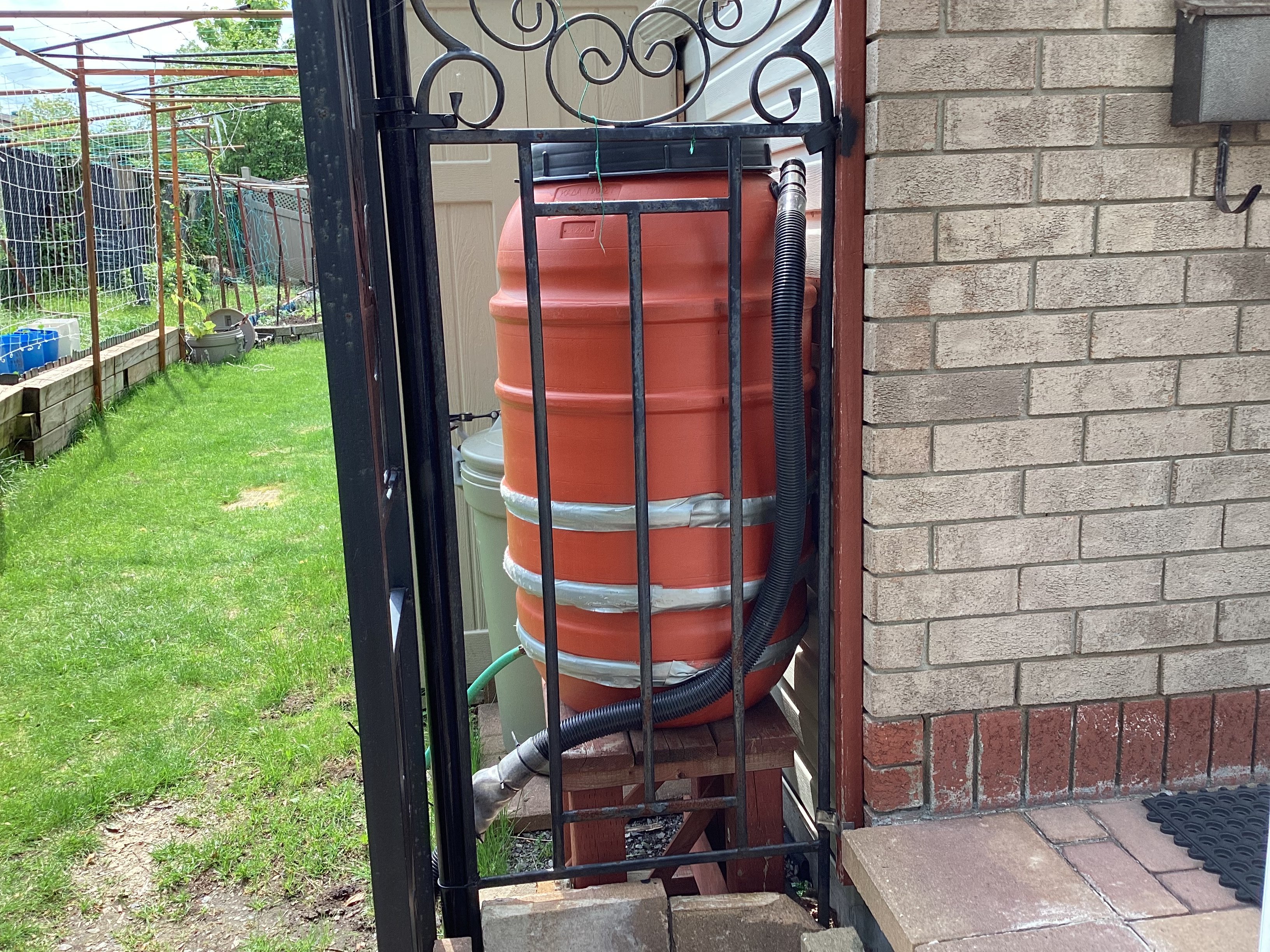 这张照片应该能清晰地看到雨水桶的溢水管,我们也是自己搭架子左侧能看到自己用塑料绳拉的网,方便丝瓜自己爬藤。