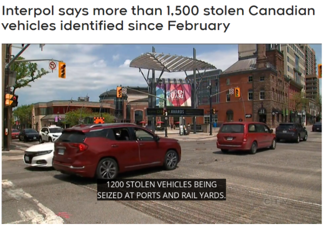 国际刑警组织表示,大多数被盗的加拿大车辆是由其他国家的执法官员在“国家入境口岸”发现的。