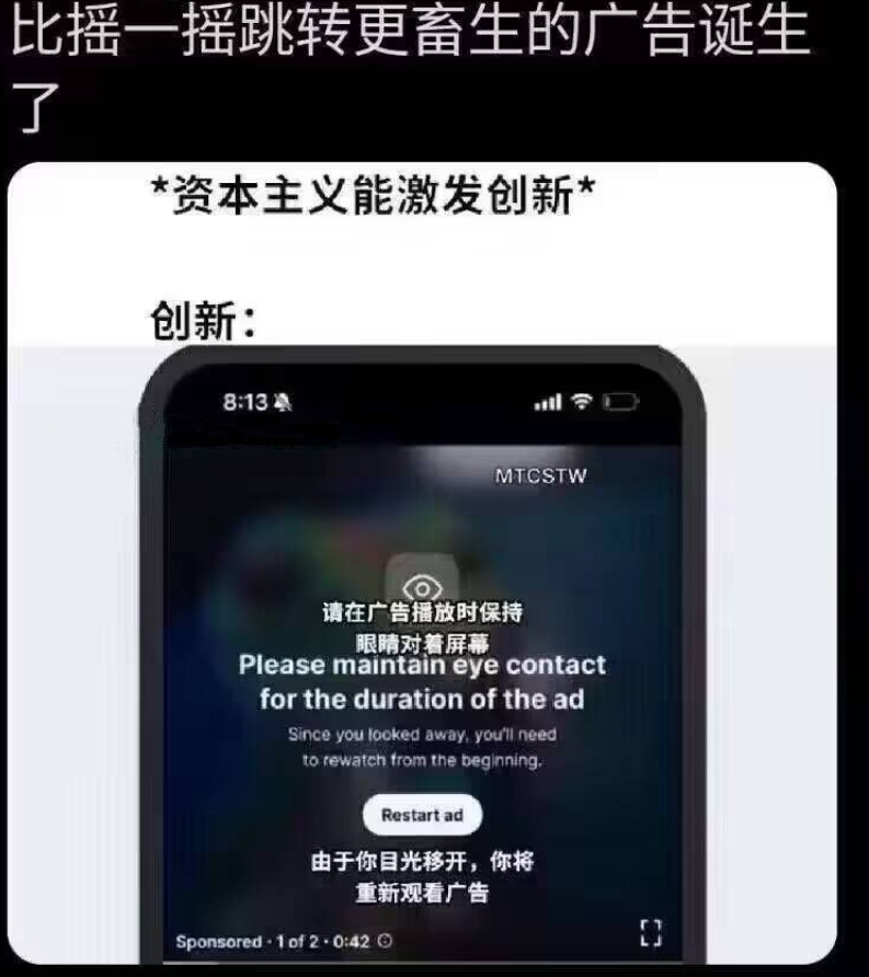 不久的将来,在旁边会有一个小窗口 “请点击,支付$$,免看广告;点击次数越多,免看时间越久;欢迎长按,没有上限” ;)