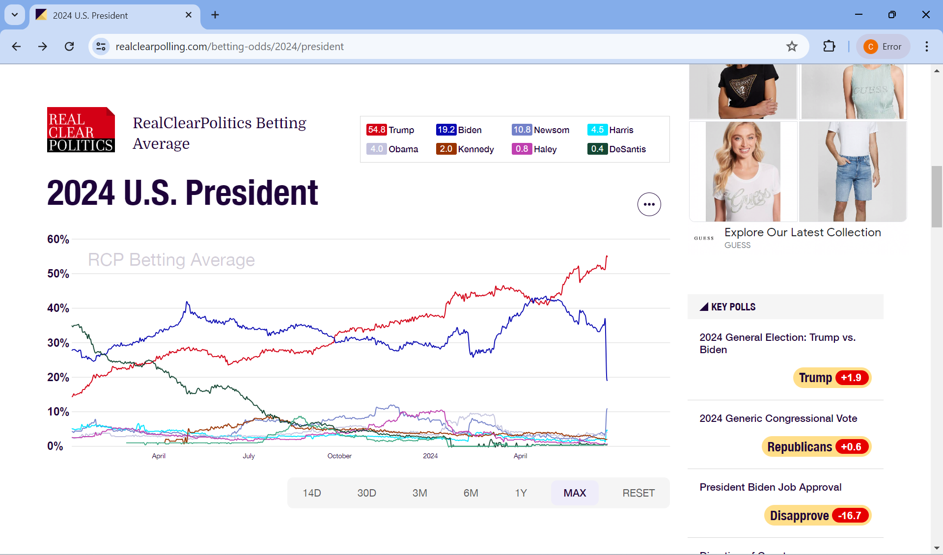 C CHRIS88 基督门徒 管理成员 VIP 注册 2006-05-10 消息 15,283 荣誉分数 1,460 声望点数 393 2024-06-28 #31 CHRIS88 说: 浏览附件1145378 点击展开... Biden curve again! This time a little different though. https://www.realclearpolling.com/betting-odds/2024/president