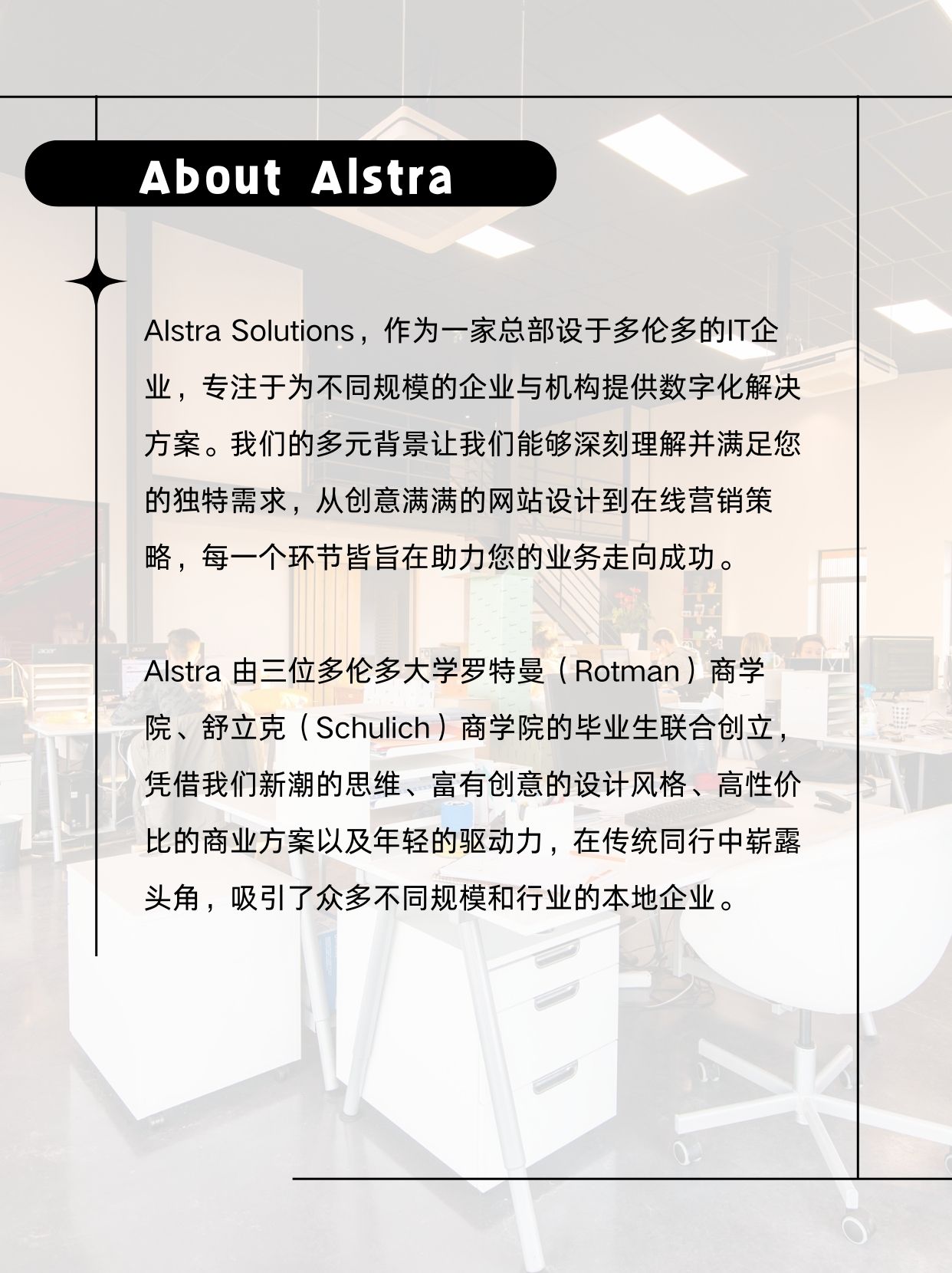 Alstra总部位于多伦多,提供全方位的网站设计和线上建设方案, 包括网站设计、电商网站建设、网店独立站设计、加拿大商户支付、在线预约系统、网校网课系统LMS建设、Google Ads投放、SEO搜索引擎优化、电子邮件营销、网站代运维和网站安全加固服务等。