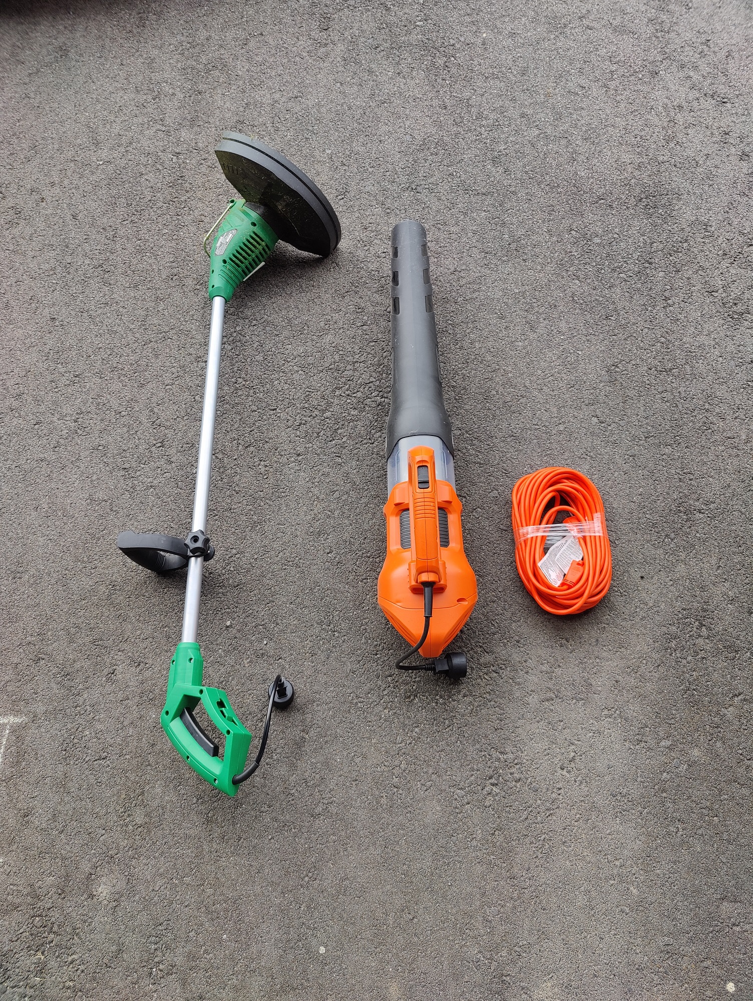 trimmer 和 blower 一共用过两次,电线完全没有拆封。 因为换了电池驱动的,不再需要了,打折处理。原价一共200多元,、现价120 块 or best offer。 Kanata 自取 613-762-0766