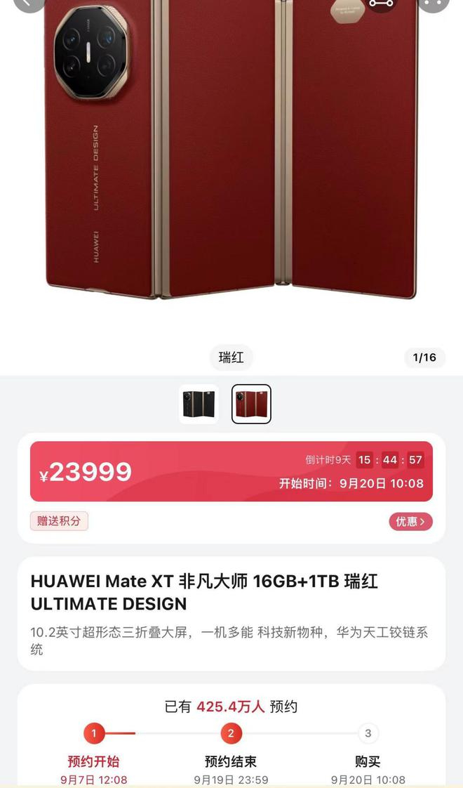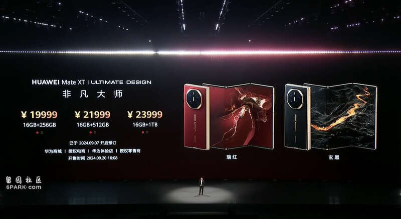 内地界面新闻报道,开启预订不到24小时内,Mate XT的预订量已经超过200万。最新的预购人数已逾425万人。在「得物」等二手平台,Mate XT部分型号炒价已是9.9万元(人民币‧下同)。多名手机渠道人士早前已表示,价格即便挂到十万元也不夸张,华为首款折叠屏Mate X就曾炒到过这个价格。