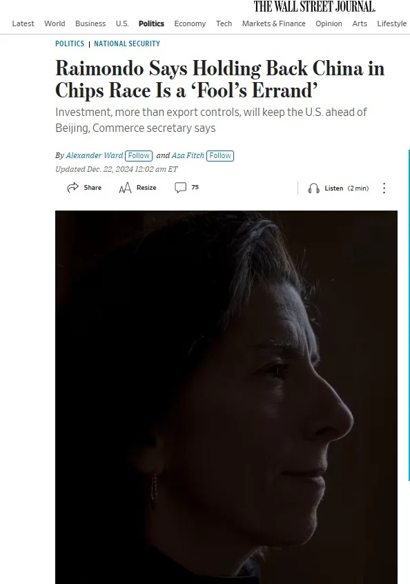 metropolis 本站元老 注册 2010-12-10 消息 12,446 荣誉分数 2,841 声望点数 373 2024-12-25 #28 向问天 说: 这么重要的新闻,这里没人提 浏览附件1163548 https://www.wsj.com/politics/national-security/china-biden-chip-manufacturing-gina-raimondo-b98c2606 点击展开... 这是美国的报刊,美国的部长承认限制出口,制裁是愚蠢的,当初不如投资更好,助力发展,还能分成,现在促成中国芯片独立发展起来了,从买方变成了卖家,到处销售,好好的一个赚钱行业,搞成白菜价。