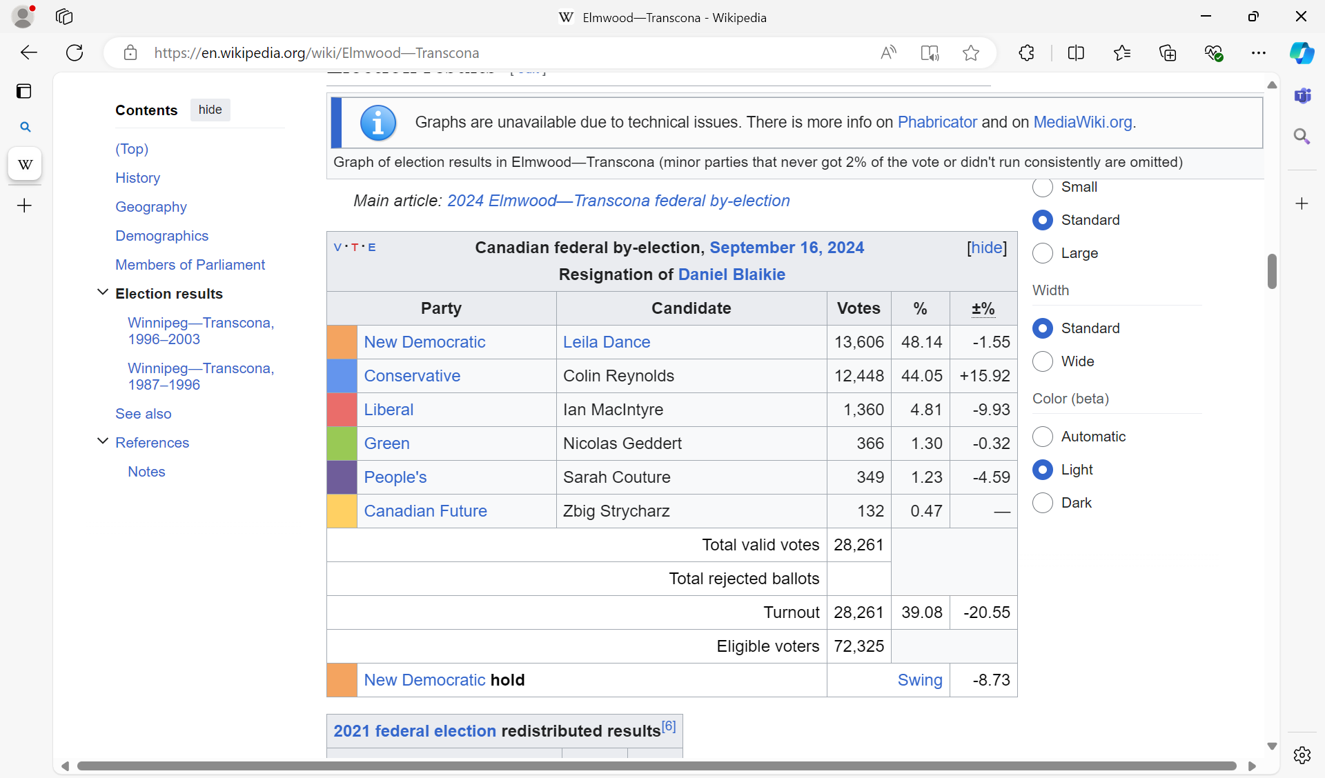 其二是在曼省的NDP铁票区的票率大幅增长近16%,逼近NDP的同时几乎让liberals选票归零,虽然惜败却为最迟明年的下届选举奠定胜选基础;Elmwood—Transcona - Wikipedia