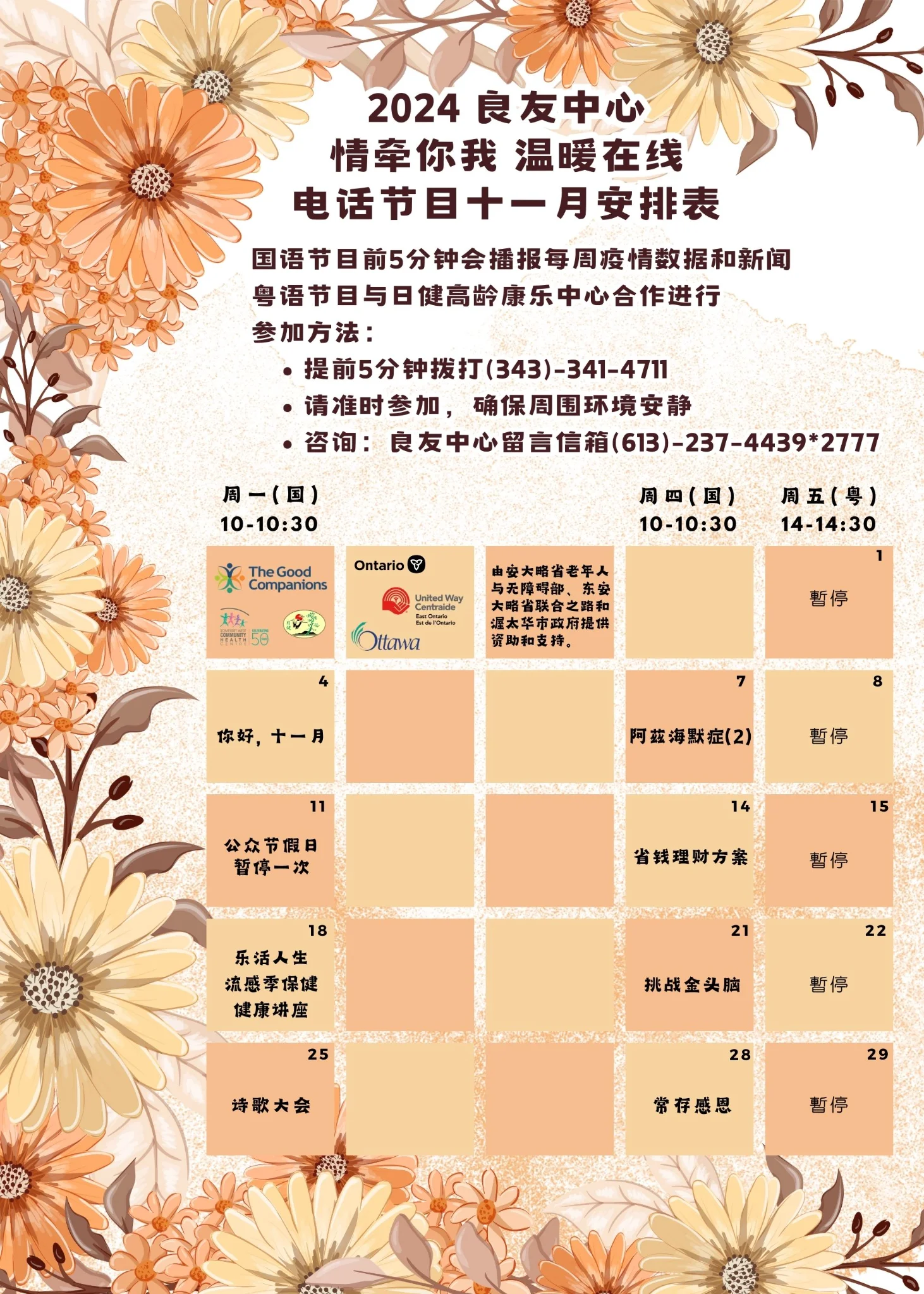 良友中心自2020年5月起,每周一和周五开展情牵你我,温暖在线电话节目。 在家就可以通过电话,线上和其他老年人一起社交,聊天,分享故事。 从2021年11月开始,普通话节目增加至每周两次:每周一和每周四10:00-10:30AM(普通话节目前5分钟会播报每周疫情新闻) 参加方式: 提前5分钟拨打343-341-4711 等待主持人连线 具体11月份电话节目内容详情,请参见安排表。 如果对我们这个项目有任何疑问,请致电良友中心中文留言信箱,613-237-4439 分机号2777.