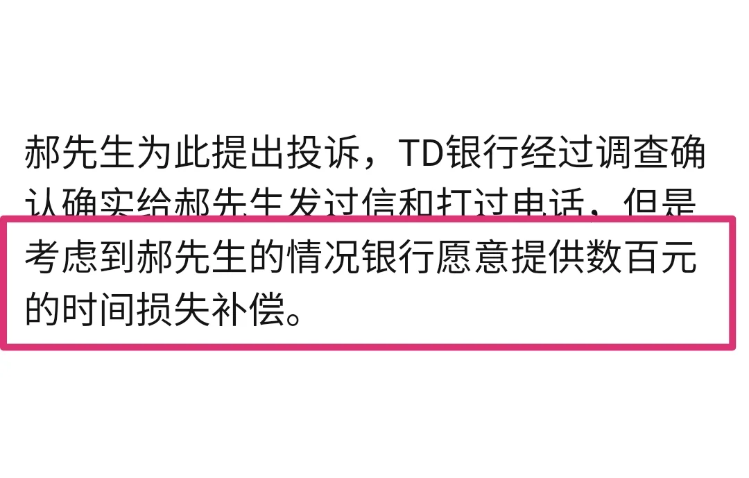 郝先生为此提出投诉,TD银行经过调查确认确实给郝先生发过信和打过电话,但是考虑到郝先生的情况银行愿意提供数百元的时间损失补偿。