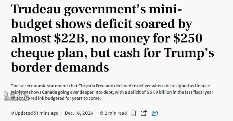 来源链接:Trudeau government’s mini-budget shows deficit soared by almost $22B, no money for $250 cheque plan, but cash for Trump’s border demands