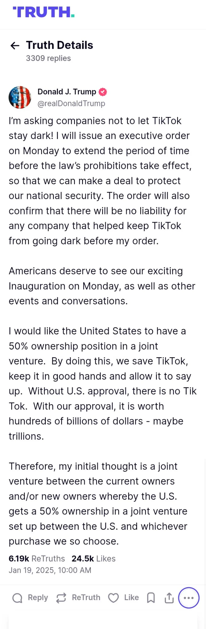I’m asking companies not to let TikTok stay dark! I will issue an executive order on Monday to extend the period of time before the law’s prohibitions take effect, so that we can make a deal to protect our national security. The order will also confirm that there will be no liability for any...truthsocial.com