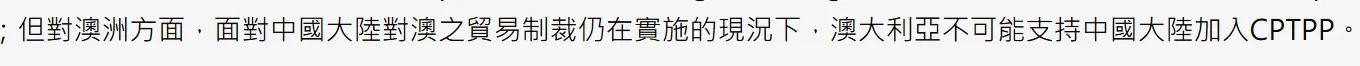 CPTPP中国完全不符合条件加入。和WTO不一样,CPTPP要求加入的时候就符合所有条件,WTO的条件只要加入国承诺改变就可以加入,所以被中国忽悠了几十年,到现在很多也没有开放。CPTPP是为排除中国量身打造的,除非政治改革,否则无法满足条件。