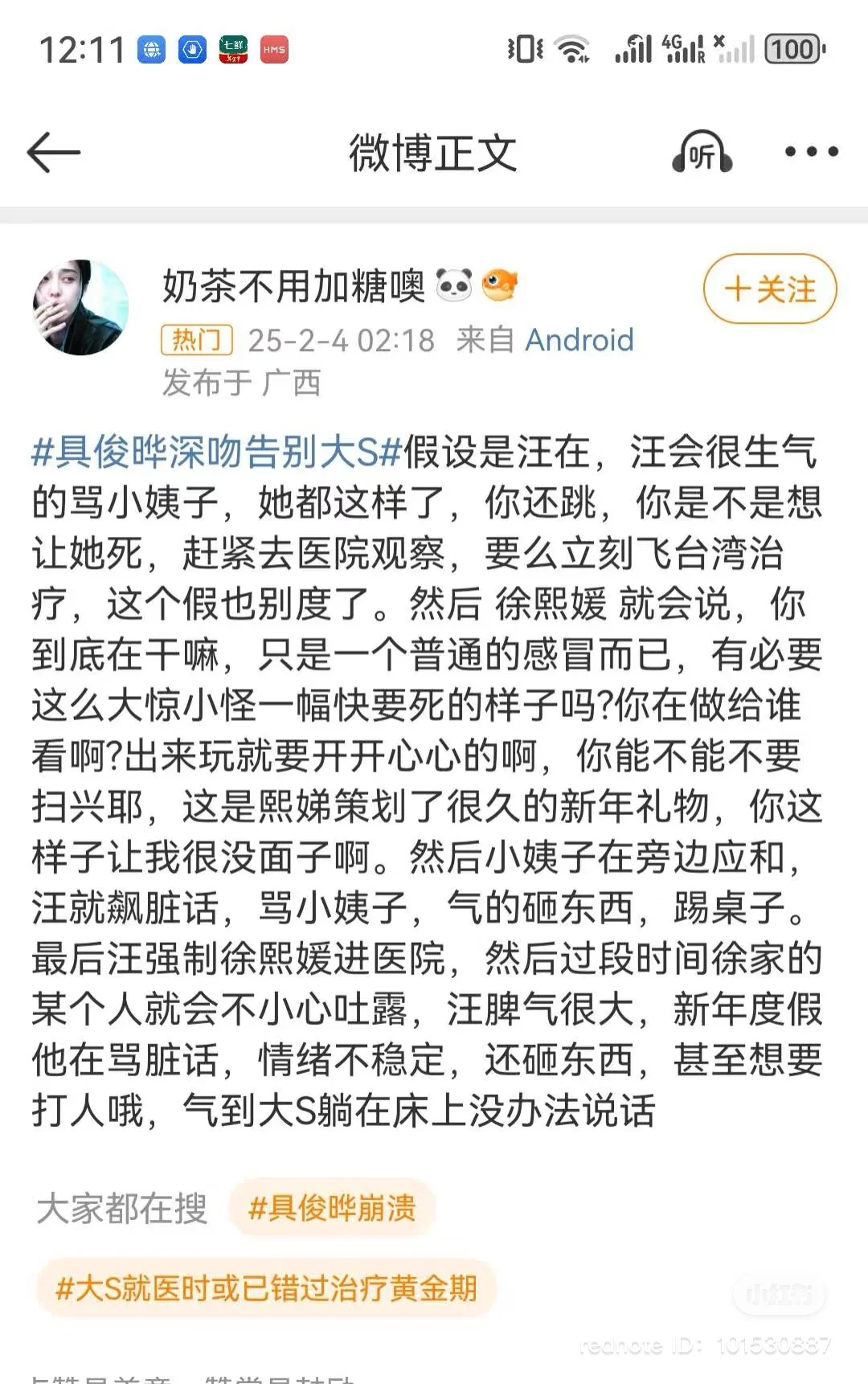 qfbb 说: 唉,大s的母亲和妹妹是个表演型性格,还有渣高丽棒子,遗产风暴,紧接着爆发。看看谁是真正爱她的亲人!喂养大家庭糊口的大s,这种类型,像梅艳芳,邓丽君,于月仙,李玟等,都活不长,身边吸血鬼太多。走了,也好,在天堂清清静静,无痛无灾。 点击展开... 她早就失去赚钱能力了。 一大家子靠汪小菲留的房产生活
