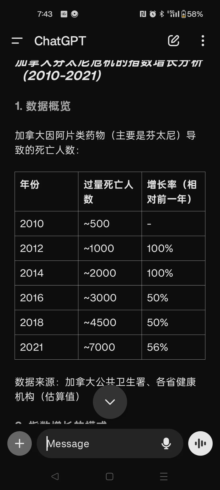 3. 饱和期(2018-2021):受害者基数变大,但控制措施(纳洛酮供应、安全注射点等)开始起效,增速略有下降,但仍然很高。