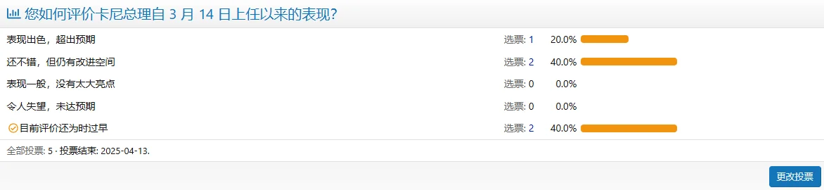 Poll:你如何评价卡尼总理自 3 月 14 日上任以来的表现?(投票结果显示公开)