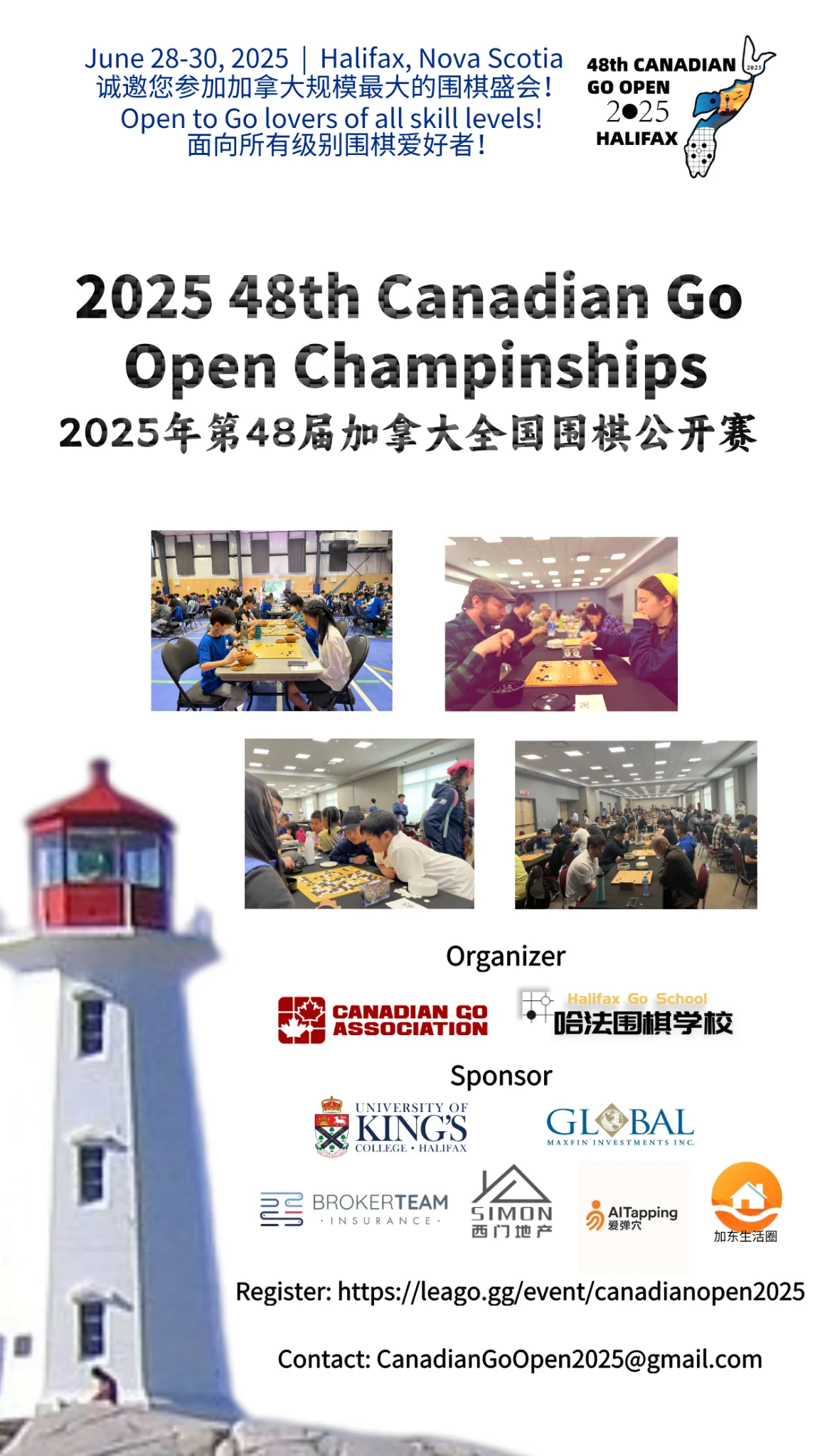 第48届(2025)加拿大全国围棋公开赛将于6月28日-30日在新斯科舍省哈利法克斯市举行!此项赛事由加拿大围棋协会(Canadian Go Association)主办,是加拿大历史最悠久、级别最高的围棋赛事!每年一届,今年是第48届。赛事面向所有围棋爱好者! 棋手从全国各个城市汇聚到赛场,是加国一年一度的围棋盛会!早鸟票截至4月15日!活动官方网站:leago.gg,详情请访问网站了解!希望更多爱好者报名参赛!