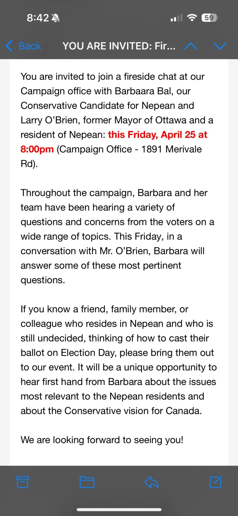 Happy68 说: 收到Nepean地区保守党候选人Barbaara Bal的邮件: 浏览附件1173831 我们需要一个安全的生活环境,相信博励治能让加拿大重新走上正轨。 周末愉快! 点击展开... Barbara真是好样的。如果她被选上,Nepean人有福了。