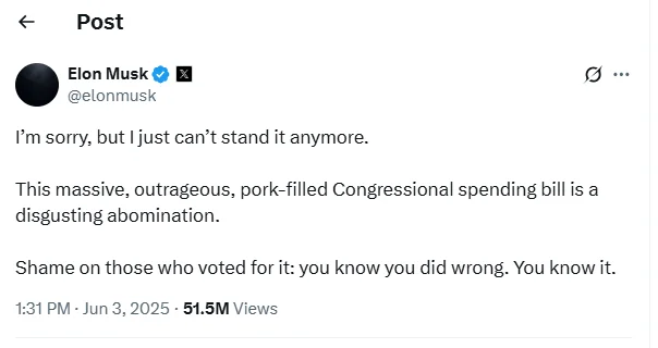 是不是该后悔拼力赞助这疯子上台?马斯克继续攻击,要求“kill the bill”。。。共和党不少的曾经“马粉”纷纷反击……说老马flat wrong。