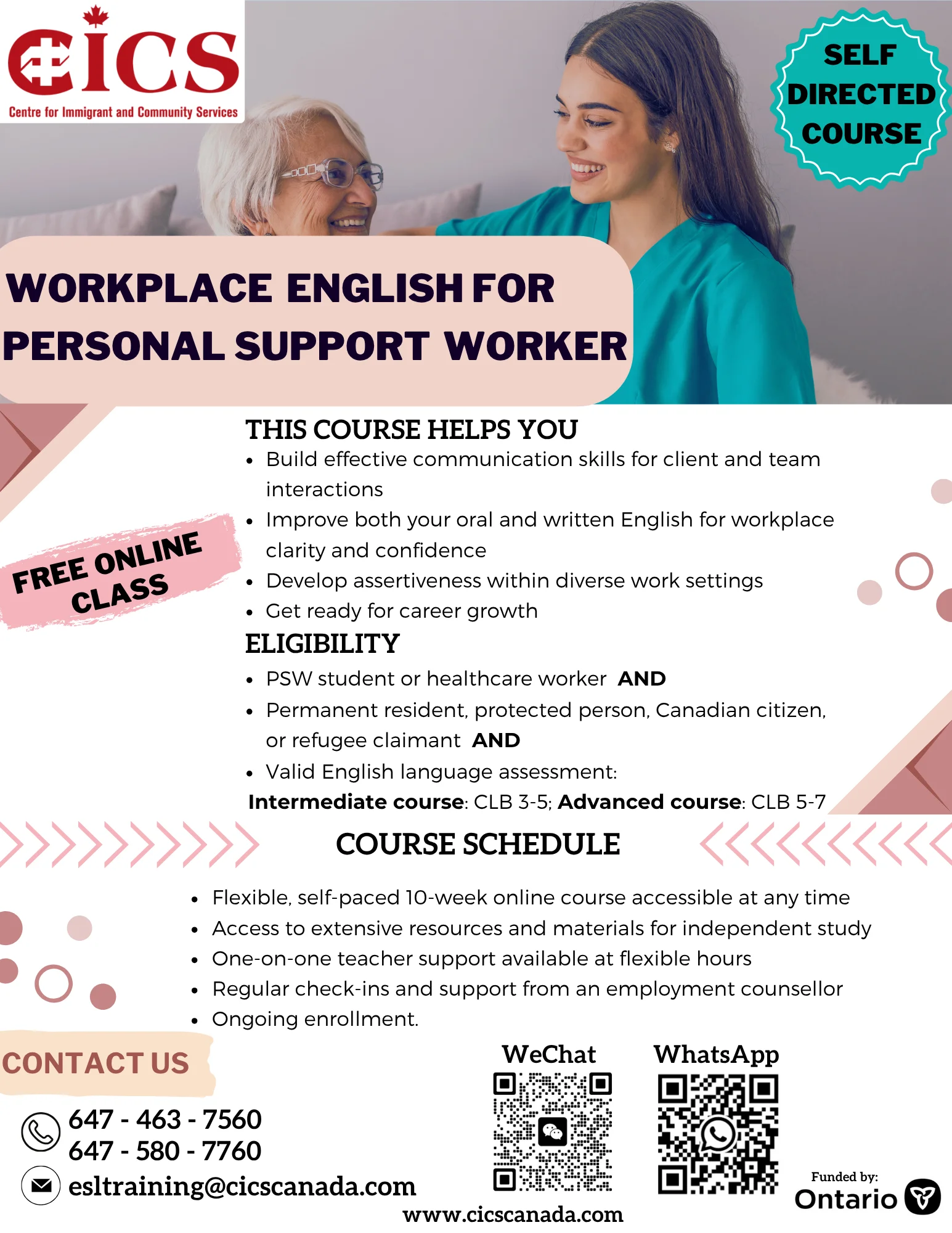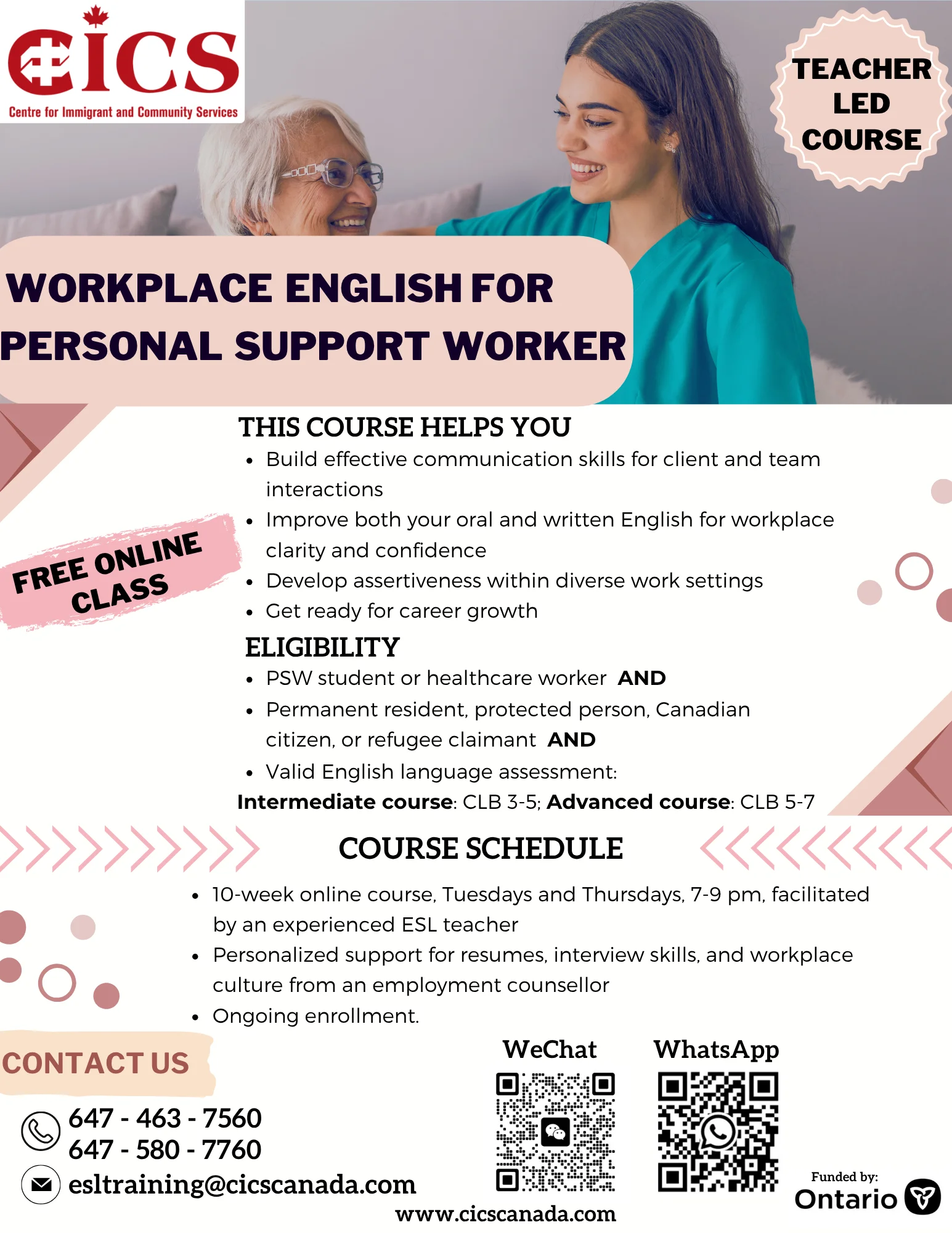Workplace English for PSW培训项目是由安省劳工、移民、培训和技能发展部(Ministry of Labour, Immigration, Training and Skills Development)资助和监管的一个培训项目,对符合条件的人员提供免费课程培训,旨在提升个人护理工作者(Personal Support Workers, PSW)的英语沟通能力,以便在为客户提供服务的过程中表现更为出色。