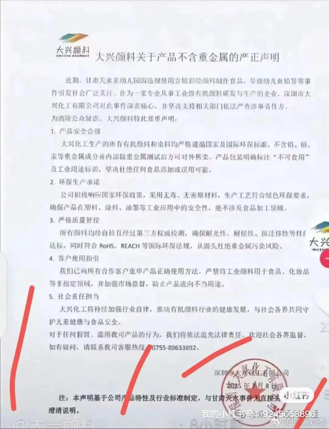 向问天 日月神教光明左使 VIP 注册 2012-09-04 消息 64,350 荣誉分数 11,677 声望点数 1,373 2025-07-10 #6 rottenmelon 说: 颜料厂拒绝背锅 浏览附件1180219 点击展开... 这家公司利用别人的不幸,趁机刷自己的流量,因为天水的通告里没有说是用了它们公司的产品。