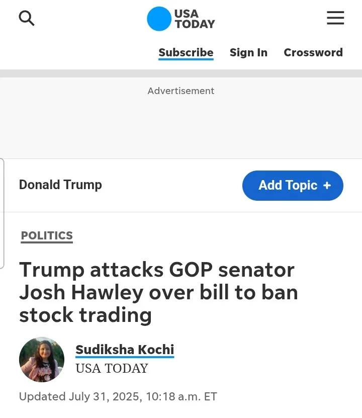 Donald Trump attacked GOP Sen. Josh Hawley as “second-tier” over his bill to ban stock trading among lawmakers, presidents and vice presidents.