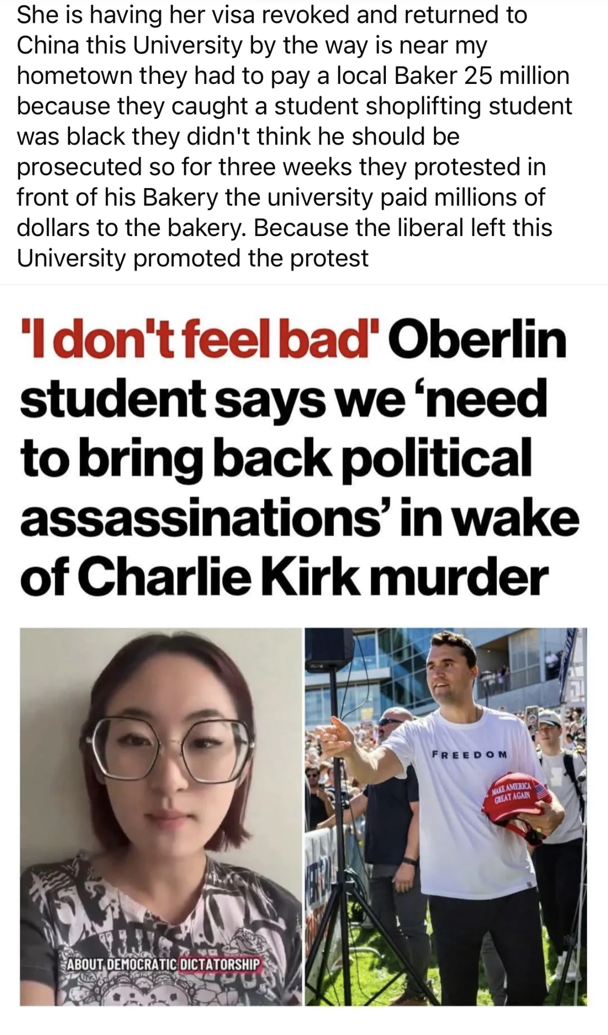 jy 说: 黑人学生偷面包被面包店抓,抓黑人学生导致抗议。抗议了大学只好赔钱给面包店。 还是看不出为啥吊销签证。是因为她去抗议了? 还有,这个可是发明了电解铝技术的欧柏林大学啊!是不是还能靠这份发明赚钱? 点击展开... Julia Xu的事情跟面包店的事情没有关系,Julia Xu是发表了关于Chalie Kirk 的言论,她跟黑人学生的联系就是他俩都是同一个学校的,发帖人明显对那个学校也不太感冒