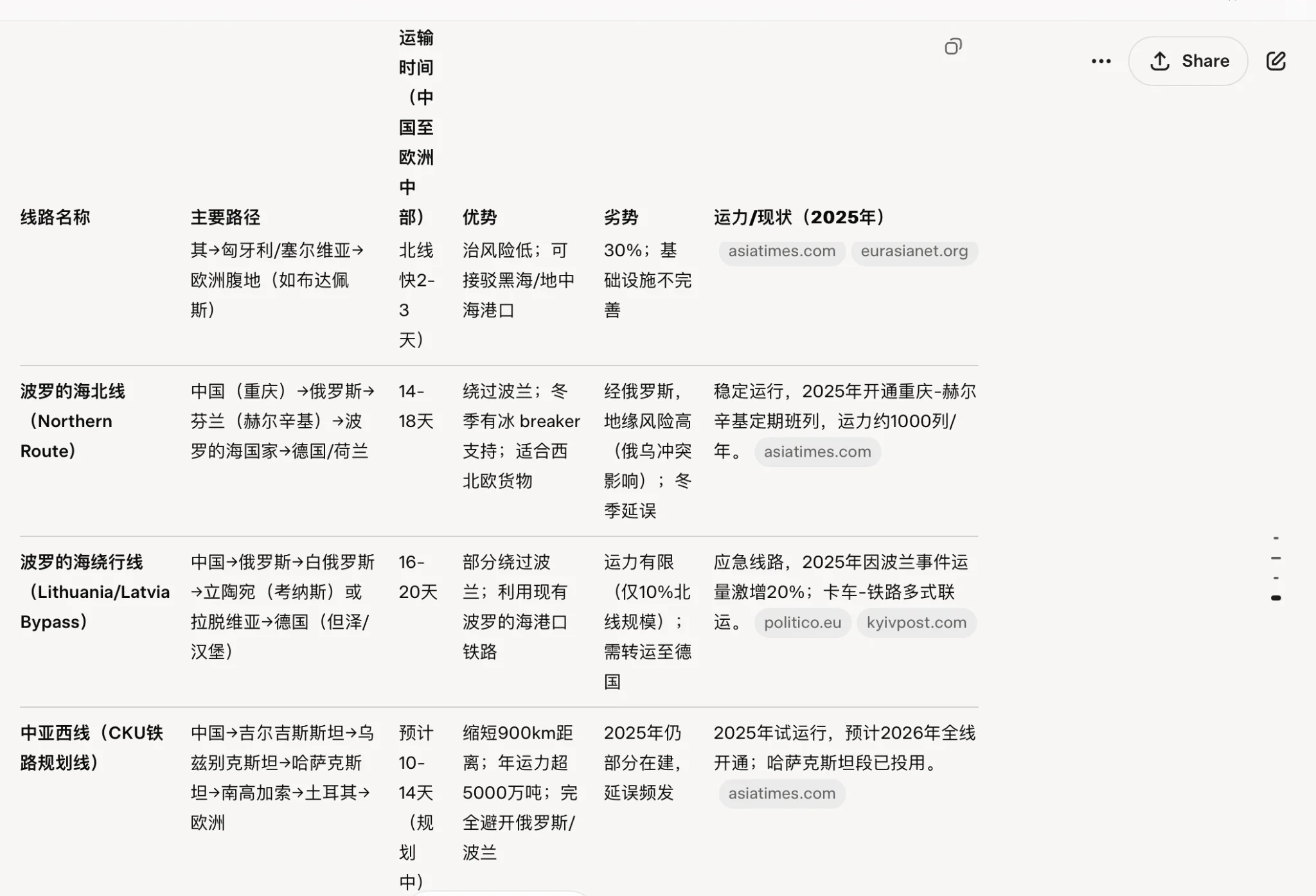 是的,中国已有多个成熟或新兴的铁路替代线路,这些线路可部分或完全绕过波兰和白俄罗斯,主要通过中亚、南高加索或波罗的海方向。这些线路虽在运力、时间和成本上不如北线(经白俄-波兰)高效,但已在“一带一路”框架下快速发展。2024年,中欧班列总开行超1.9万列,替代线路占比已从5%升至15%以上。 以下是主要替代线路的比较(基于2025年数据)