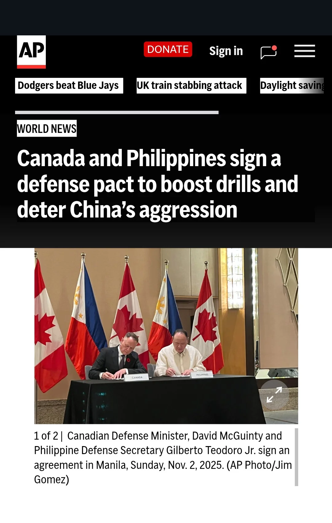 红 红红枫叶 新手上路 注册 2024-11-03 消息 651 荣誉分数 91 声望点数 28 昨天 10:29 #1 Canada and Philippines sign a defense pact to boost drills and deter China’s aggression