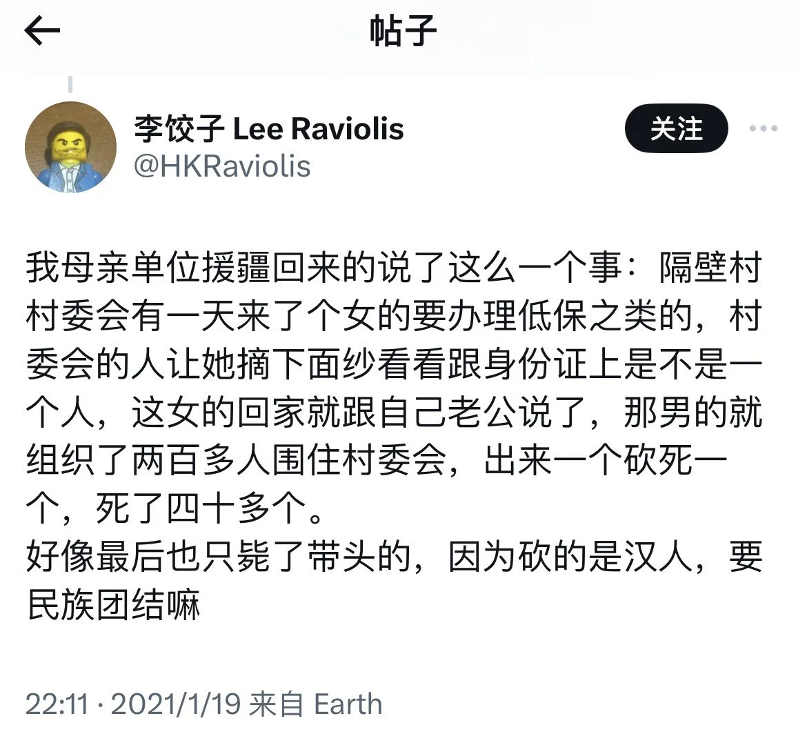 茶马盐铁 说: 2021年嘛。 已经算是疫情后了。 如果说2020年之前,新疆还有各种骚乱和血腥的话, 2020年后, 就是一片祥和了。 怎么2021年还有这种事情呢? 点击展开... 可你题目说的是今天
