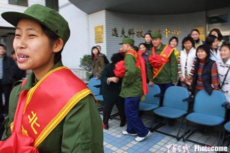 2004年12月10日,北京理工大学欢送参军入伍的同学们踏上征程。参军入伍的女大学生与同学们告别。 园园/中青在线/Photocome