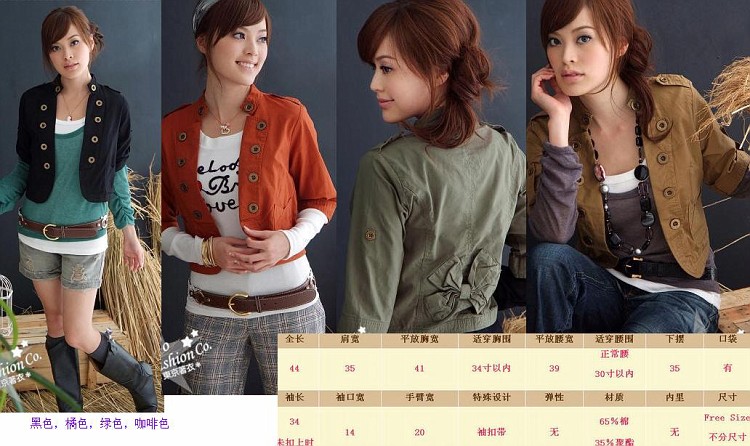 展现英挺的个性☆立领铜扣外套 $43 商品简介~* 藉由俐落的军装剪裁及英挺的服装线条 表现独具帅气的极致魅力 短版样式制造俐落的层次感 采取挺拔的小立领及造型铜扣的个性元素 带你迈向具时尚感的率性路线 运用隐藏式袖带,可将袖子卷起扣上成率性短袖 或放下成简洁五分袖,都能自然展现内搭的造型层次 巧妙地于背部装饰俏丽蝴蝶结 为帅气风格带来一分女孩专属的甜美味道 只要换上它,就能展现英气逼人的亮眼风采^^ ps.铜扣皆不可开,内搭、项链及腰带皆为另外搭配