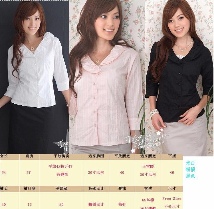 温柔知性感☆翻领珠扣七分衬衫 $32 商品简介~* 此款美衣虽然是衬衫式的设计 却能充分掌握女性的温柔婉约的迷人特质 采用具圆蓬感的双重泡泡翻领,形成十足的俏丽美感 藉由小巧的光彩珍珠扣,更添美衣质感 成功引领温柔甜美的知性氛围~* 衣身隐约的直条纹,会让身材看来更修长纤细喔^^ ps.内搭、腰带皆为另外搭配