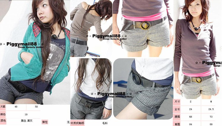 展露美腿线条附大扣环亮面皮带千鸟格短裤-黑灰,黑白 $38