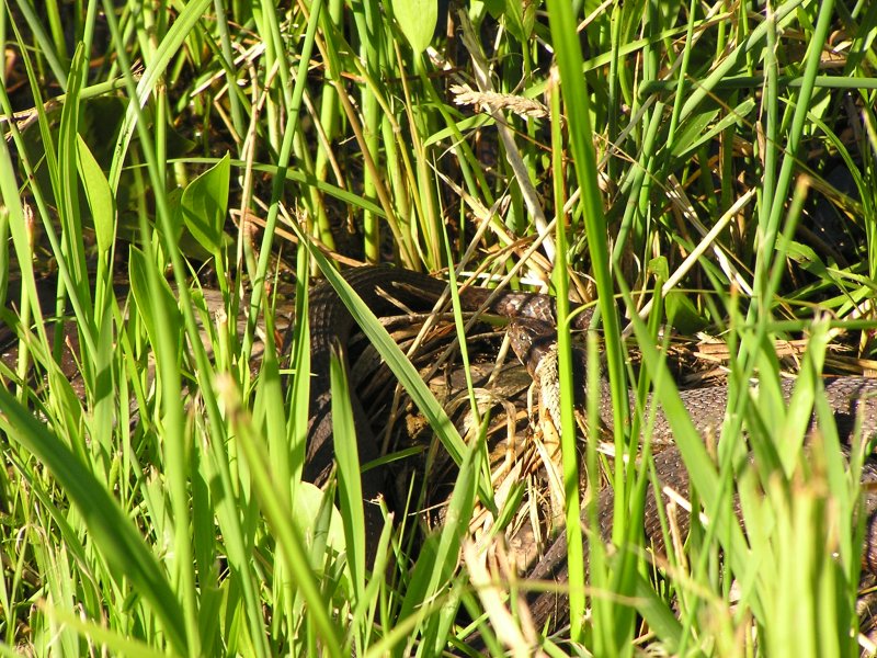 头一次是夏日上午,在日本大使馆旁的渥太华河边的一条小路上。蛇约大姆指粗细,算是条小蛇吧。它晒着暖洋洋的太阳,昂起头,身子蜿蜒,尾巴还在路边的草丛中。蛇的土褐色的镶有中黄线的背部连带青黄的边,头颚下及腹部则略显淡黄。